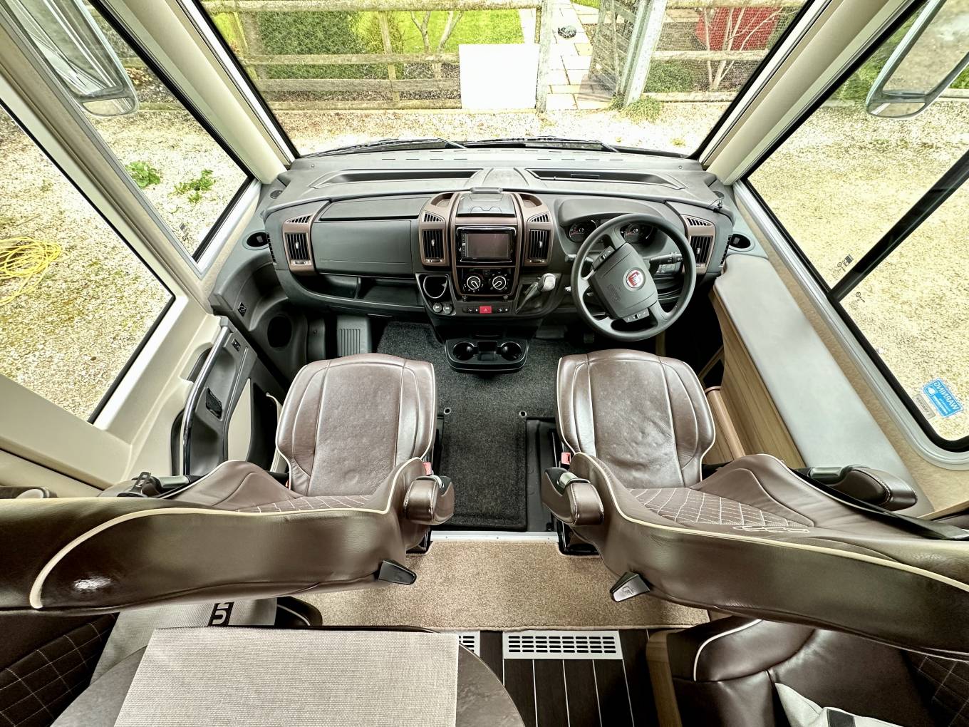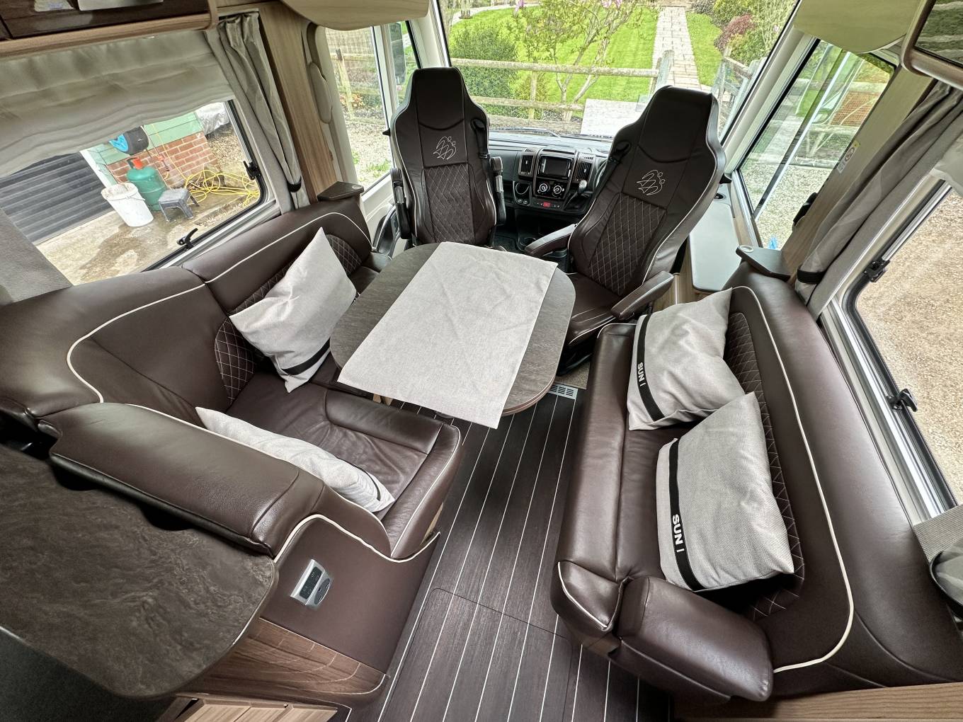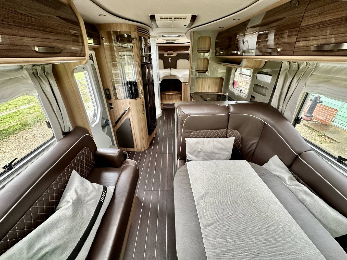 To the rear, we start off with the desirable fixed twin beds over a large garage which can be accessed from 2 outside lockers. Next, is the spacious en-suite bathroom with separate shower cubicle with Perspex shower screen, wash basin with vanity unit and toilet. Adjacent is the incredibly well equipped kitchen with 3 burner hob, sink with drainer and mixer tap, microwave, combination oven and grill and large tower fridge freezer. There is an abundance of storage including a stylish wine cabinet. As we progress forward through this spacious motorhome we arrive at the naturally bright centre dinette with panoramic views. This area comfortably seats 6 people by utilising the ingenious swivelling captain seats and includes an extendable table and electronically elevating TV, perfect for relaxing or entertaining. Finally, there is an extremely comfortable drop down double bed over the cab seats which completes this beautifully crafted 4 berth motorhome.