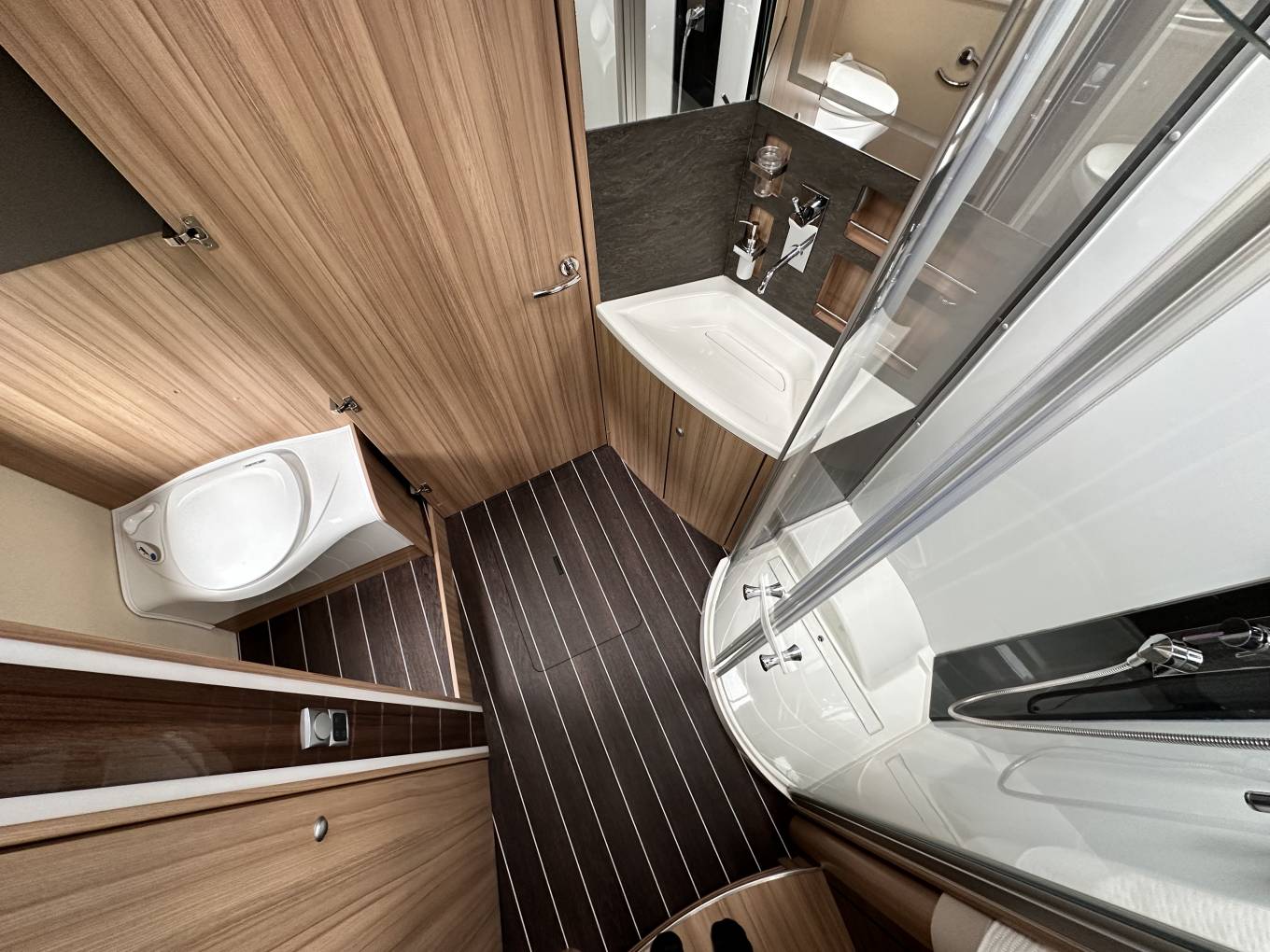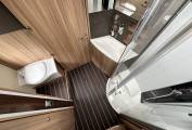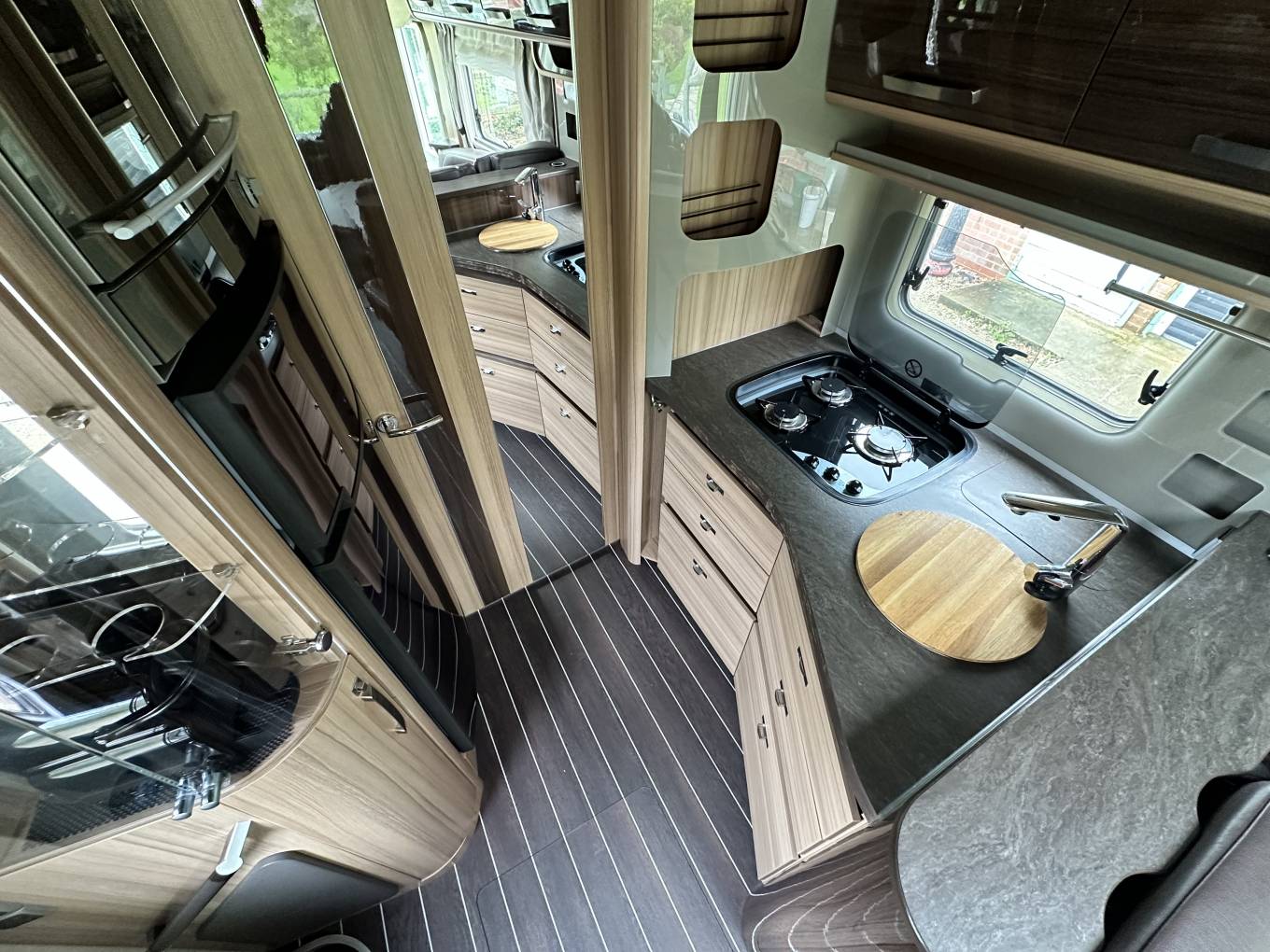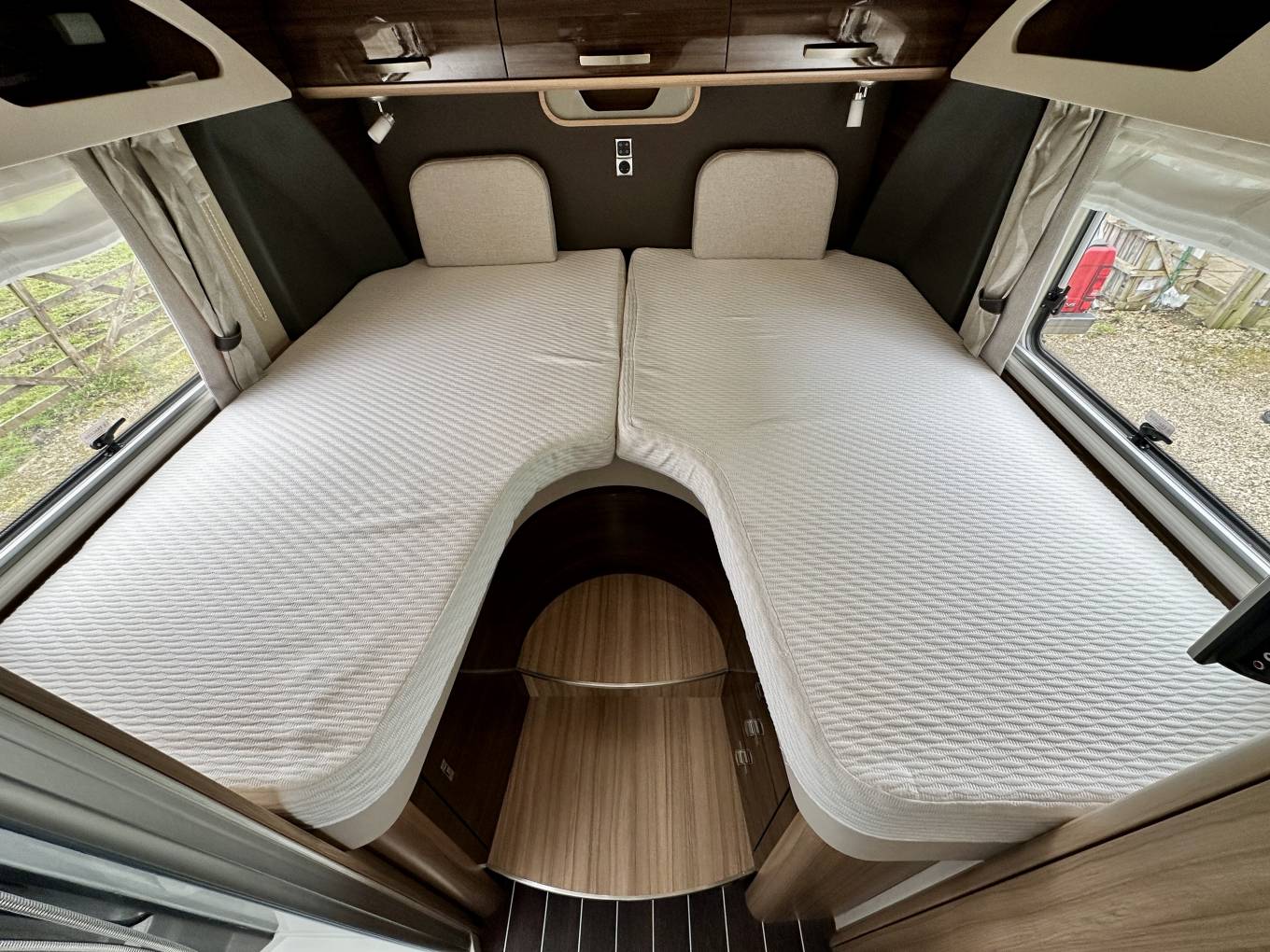 To the rear, we start off with the desirable fixed twin beds over a large garage which can be accessed from 2 outside lockers. Next, is the spacious en-suite bathroom with separate shower cubicle with Perspex shower screen, wash basin with vanity unit and toilet. Adjacent is the incredibly well equipped kitchen with 3 burner hob, sink with drainer and mixer tap, microwave, combination oven and grill and large tower fridge freezer. There is an abundance of storage including a stylish wine cabinet. As we progress forward through this spacious motorhome we arrive at the naturally bright centre dinette with panoramic views. This area comfortably seats 6 people by utilising the ingenious swivelling captain seats and includes an extendable table and electronically elevating TV, perfect for relaxing or entertaining. Finally, there is an extremely comfortable drop down double bed over the cab seats which completes this beautifully crafted 4 berth motorhome.