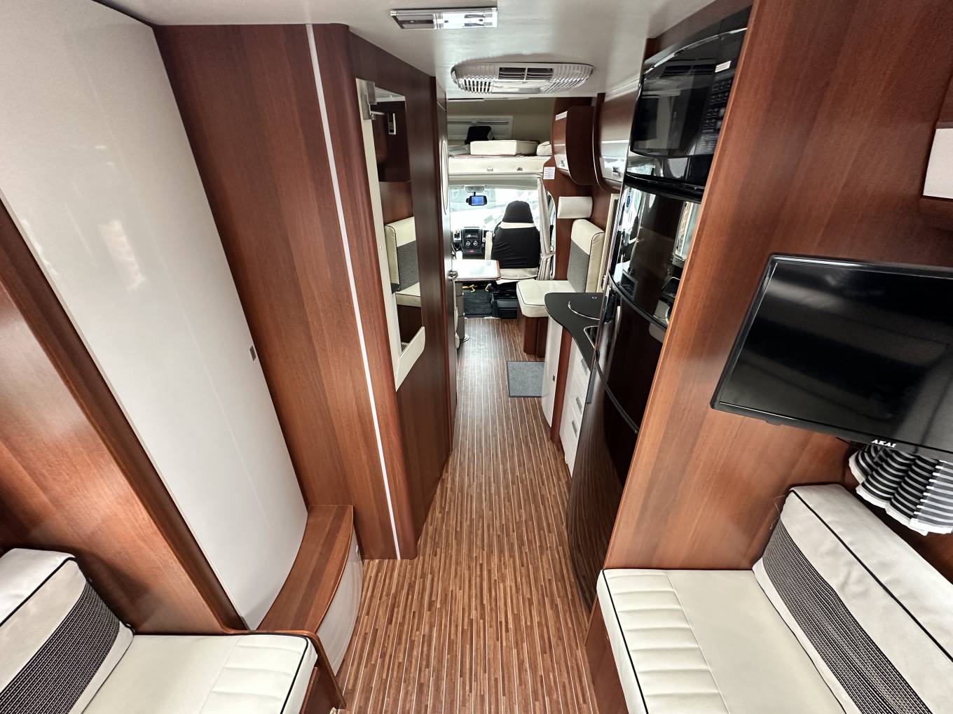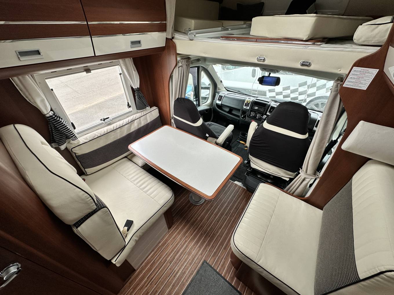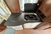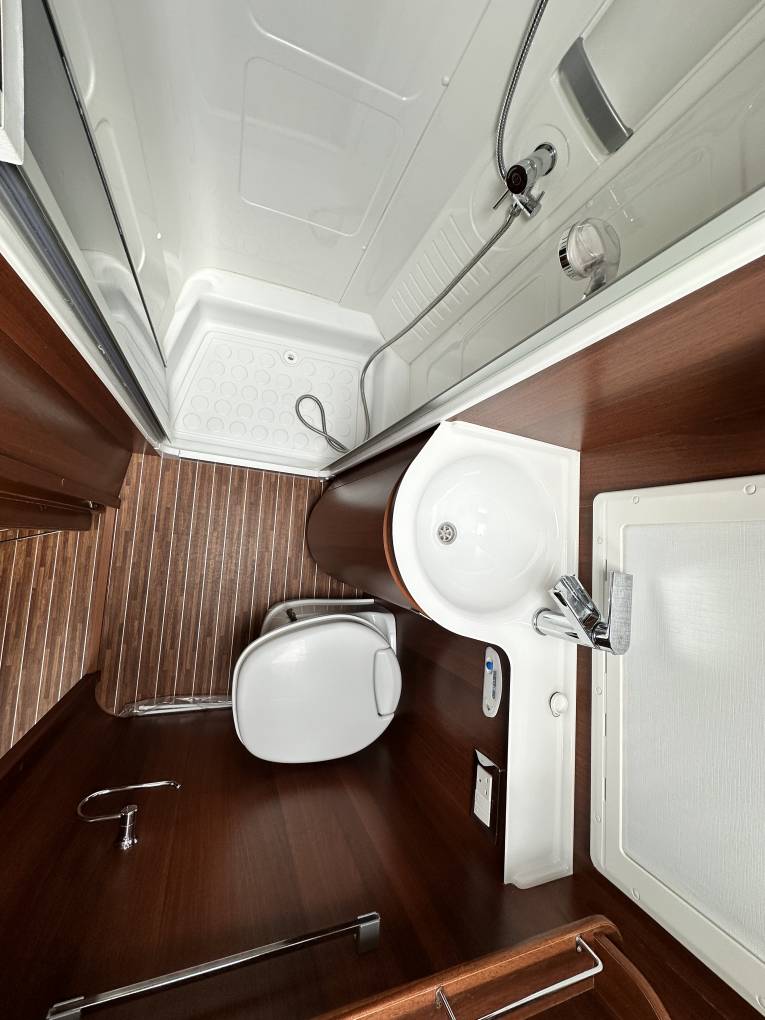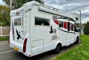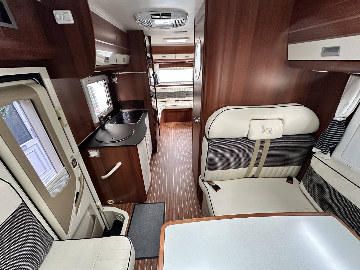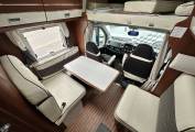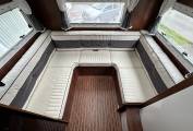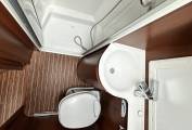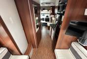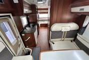 First we start at the rear of the motorhome where you will find a spacious U shaped lounge over a large storage garage. As the night draws in this turns into a comfortable double bed. Next you will find the well equipped kitchen complete with oven grill combi, 3-burner hob, large fridge with separate freezer and sink with mixer tap. Adjacent to this, you will find a luxury washroom with vanity sink unit, cassette toilet and separate shower cubicle. Mahogany panelling is offset by white cupboard inserts to create a stylish and bright interior. As we move forward through this well designed motorhome we arrive at the centre dinette which comfortably seats 5 people, including an extendable table. This also converts to a sleeping area. Finally, there is a drop down double bed over the cab seats which completes this 6 berth motorhome.