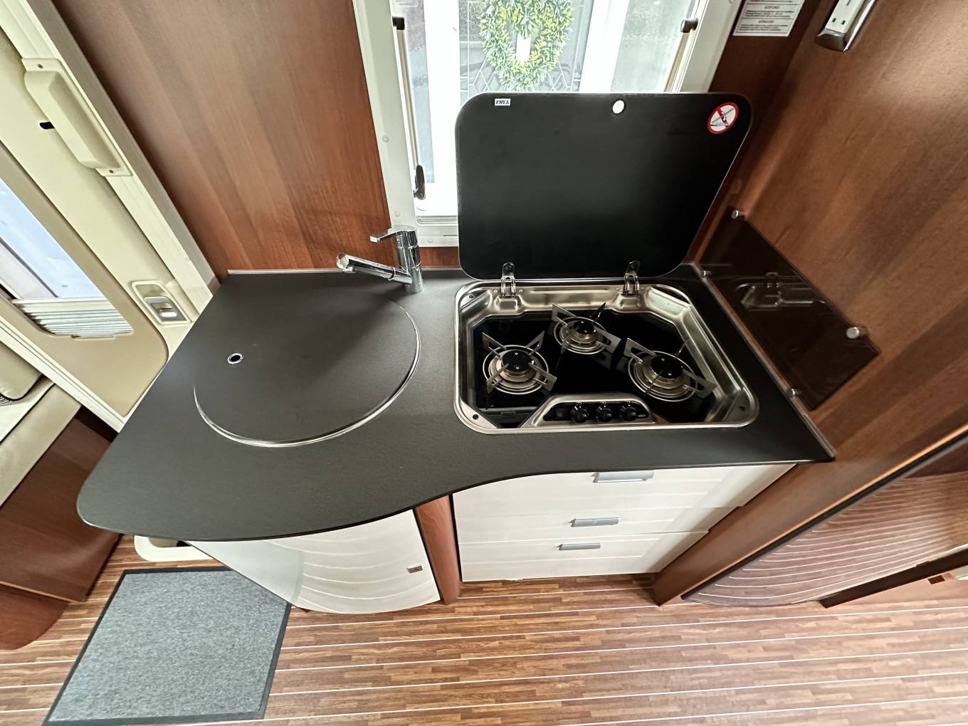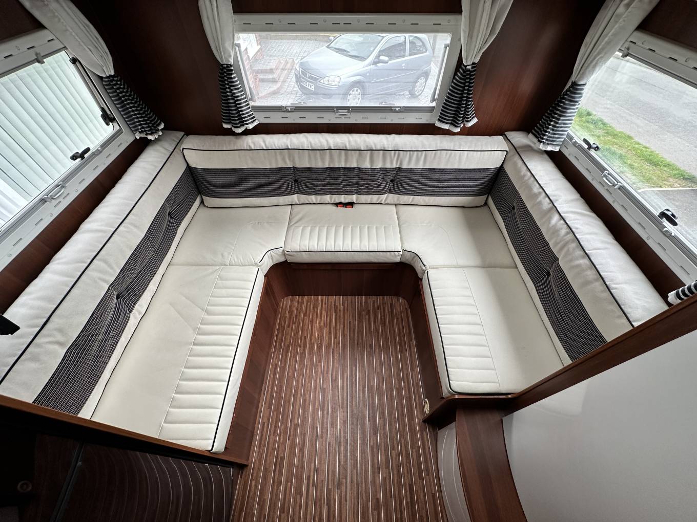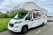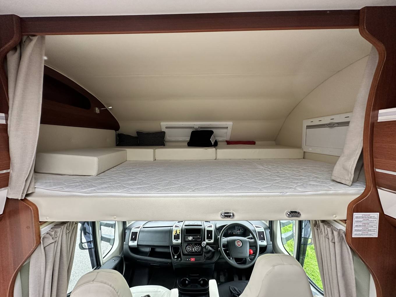 First we start at the rear of the motorhome where you will find a spacious U shaped lounge over a large storage garage. As the night draws in this turns into a comfortable double bed. Next you will find the well equipped kitchen complete with oven grill combi, 3-burner hob, large fridge with separate freezer and sink with mixer tap. Adjacent to this, you will find a luxury washroom with vanity sink unit, cassette toilet and separate shower cubicle. Mahogany panelling is offset by white cupboard inserts to create a stylish and bright interior. As we move forward through this well designed motorhome we arrive at the centre dinette which comfortably seats 5 people, including an extendable table. This also converts to a sleeping area. Finally, there is a drop down double bed over the cab seats which completes this 6 berth motorhome.