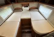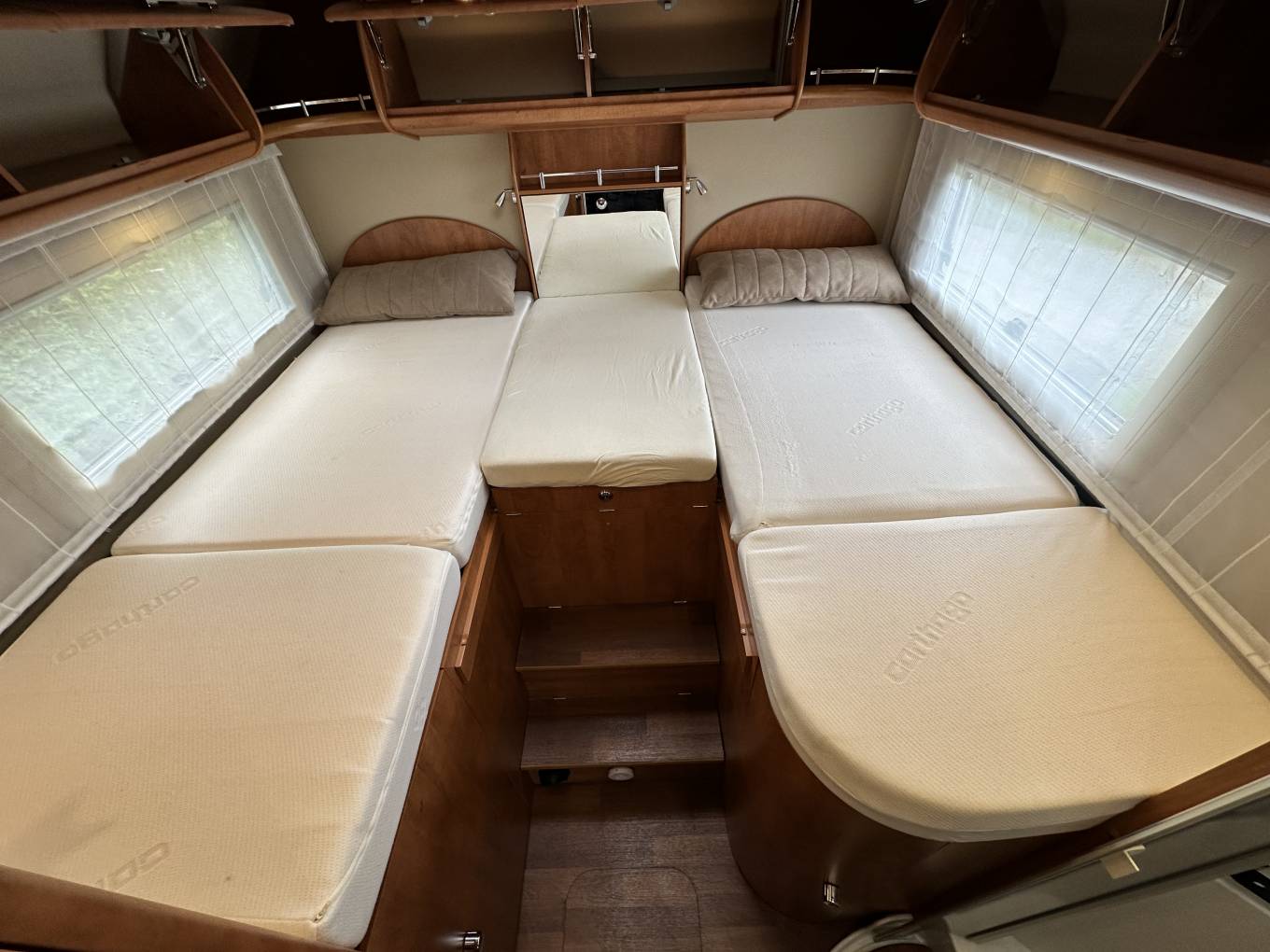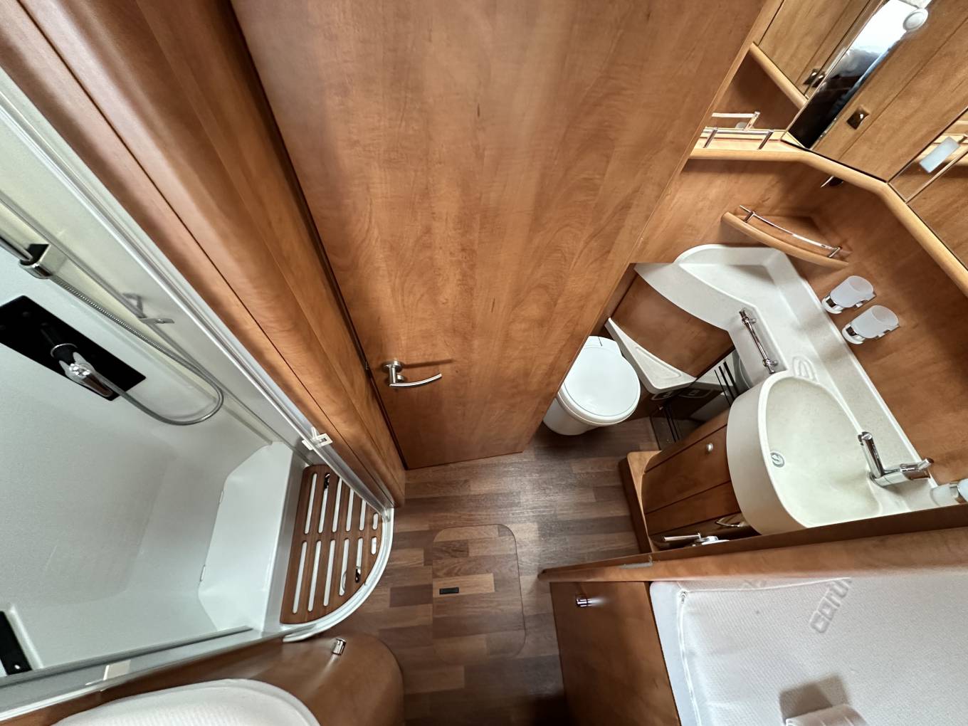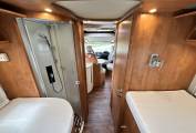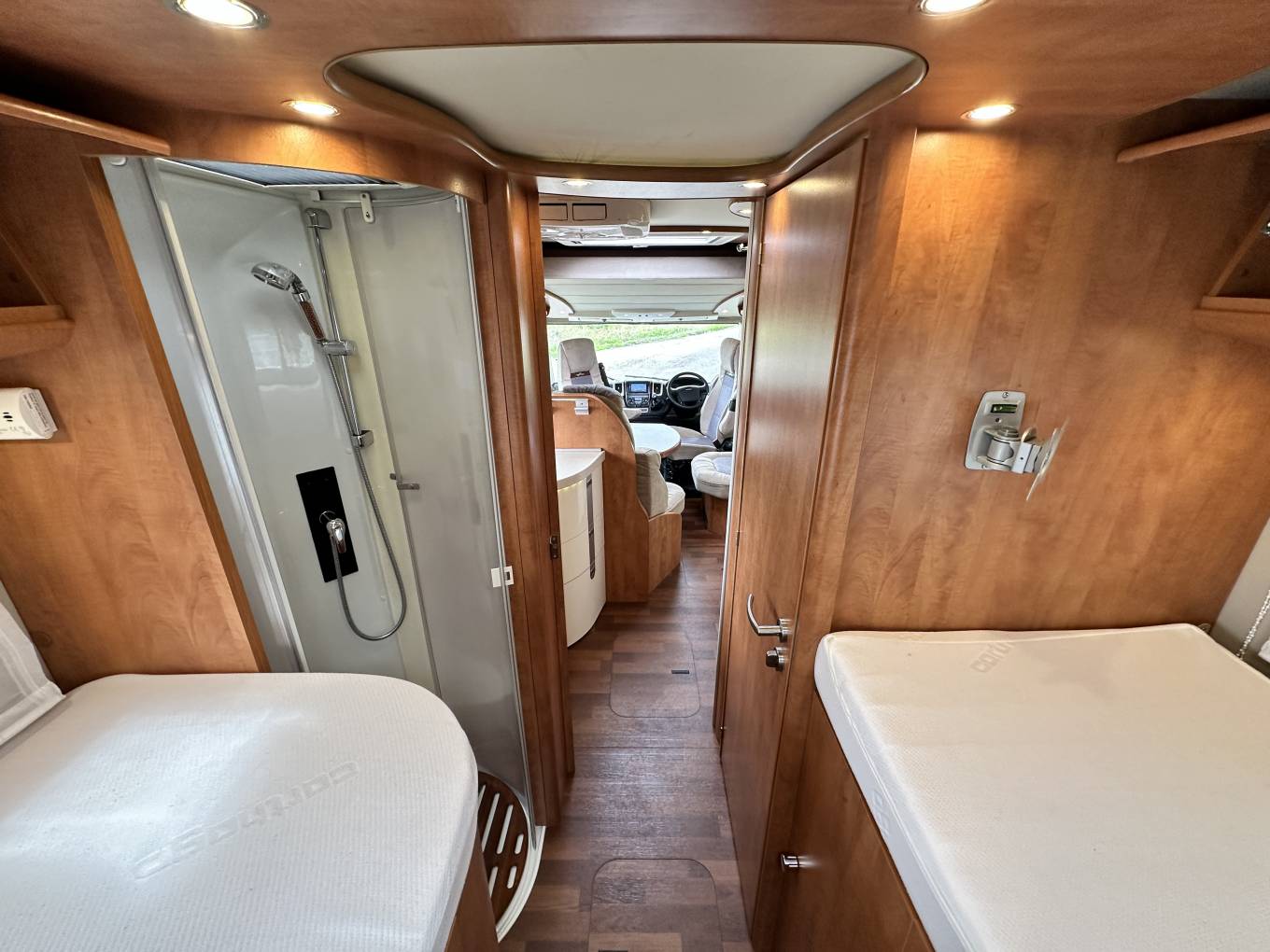 Next let’s take a tour around this luxury Motorhome. We start at the rear were you will find fixed twin single beds which can be set up as a large transverse double bed complete with reading lights and storage above. The mid washroom has a vanity wash basin with mixer tap, Thetford cassette toilet with SOG system, medicine cabinet and mirror. Across the hallway is the separate shower cubicle. The two washroom doors also close across the aisle to give privacy to the rear of the motorhome. Moving forward you will find the well equipped kitchen complete with sink with mixer tap, 3 hob gas burner, large dometic tower fridge with separate freezer box, combination over and grill, drop down coffee pod machine and ample storage. Next you will find the light and airy L shape lounge area which can seat everyone comfortably at meal times, including a hidden pull up Alphatrontics TV. Finally there is a double drop down bed above the cab seats completing this 4 berth motorhome. Outside of the motorhome you will find a large, alarmed, rear sports garage accessible from either side with large access doors.