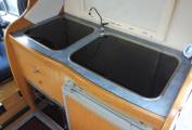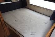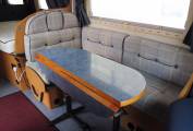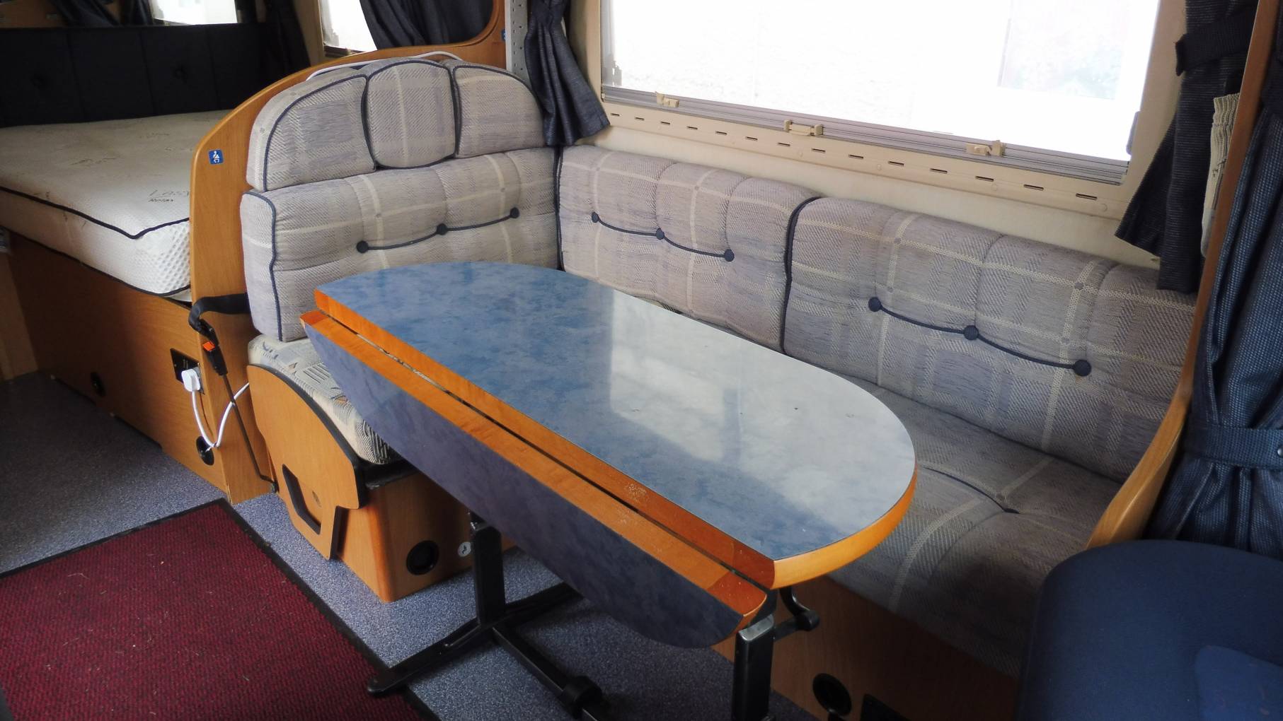 Enter through the habitation door and step into a spacious living area with an L-shaped lounge with a folding table. When you swivel the captain’s chairs you have entertaining room for up ot 6 people. Opposite sits a galley kitchen which has a SMEV combination oven, 3-burner hob, 3-way fridge and sink. A microwave is also fitted into one of the overhead lockers – everything you might need to rustle up a snack or prepare the evening meal.