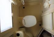 Moving rearwards a French bed sits in the nearside corner with huge storage space underneath and a well-sized washroom is in the offside corner comprising vanity sink unit, cassette toilet and a shower separated by curtain. There is a large hanging wardrobe and loads of overhead lockers. Storage is not going to be an issue with this motorhome.