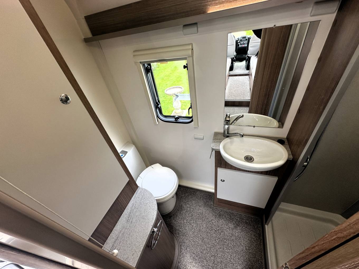 shower cubicle, Thetford cassette toilet, handwash basin with vanity unit and a