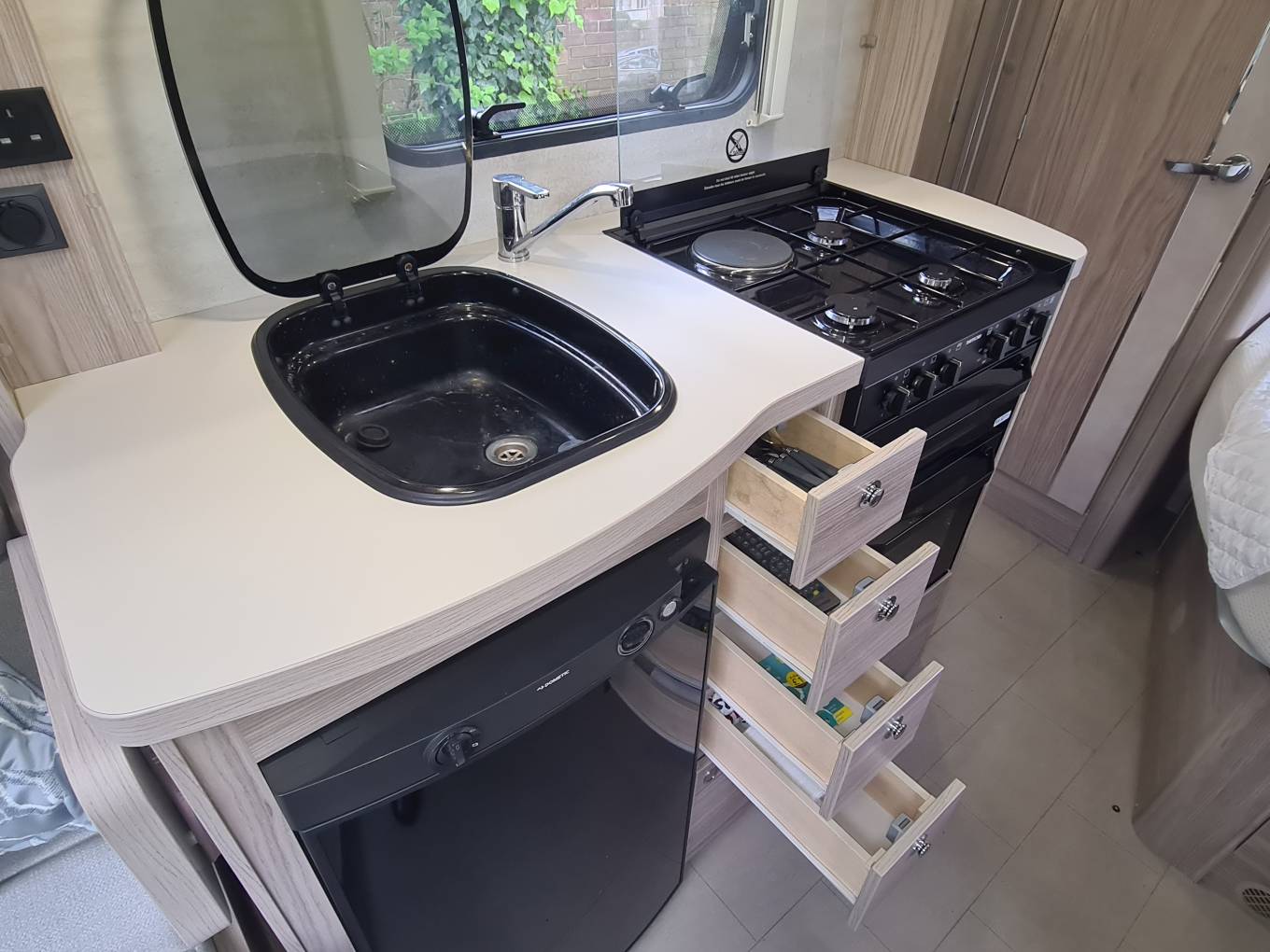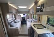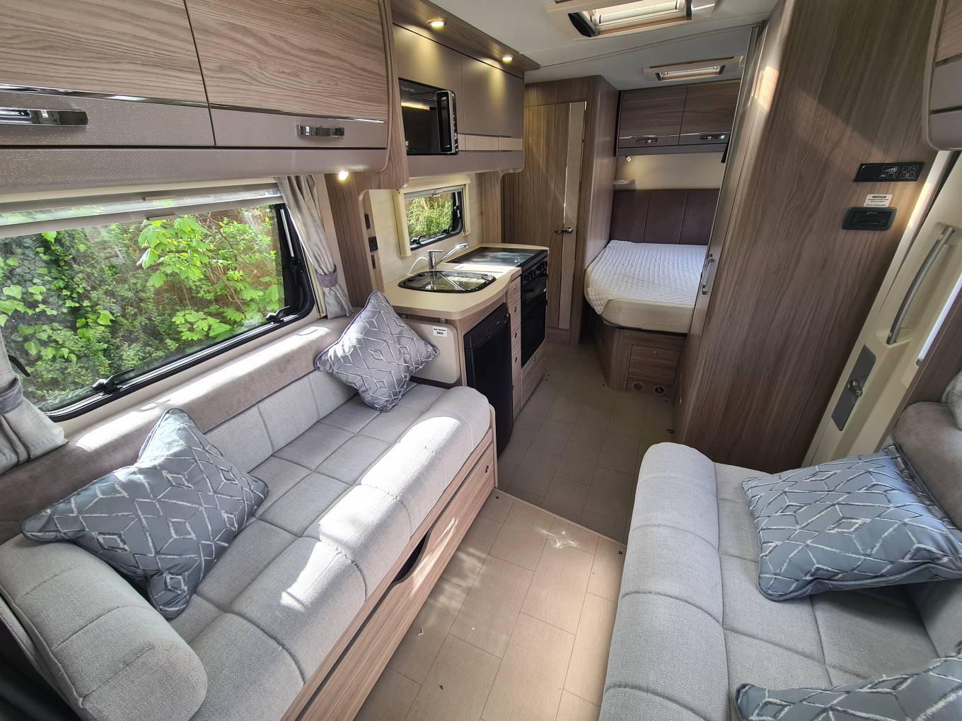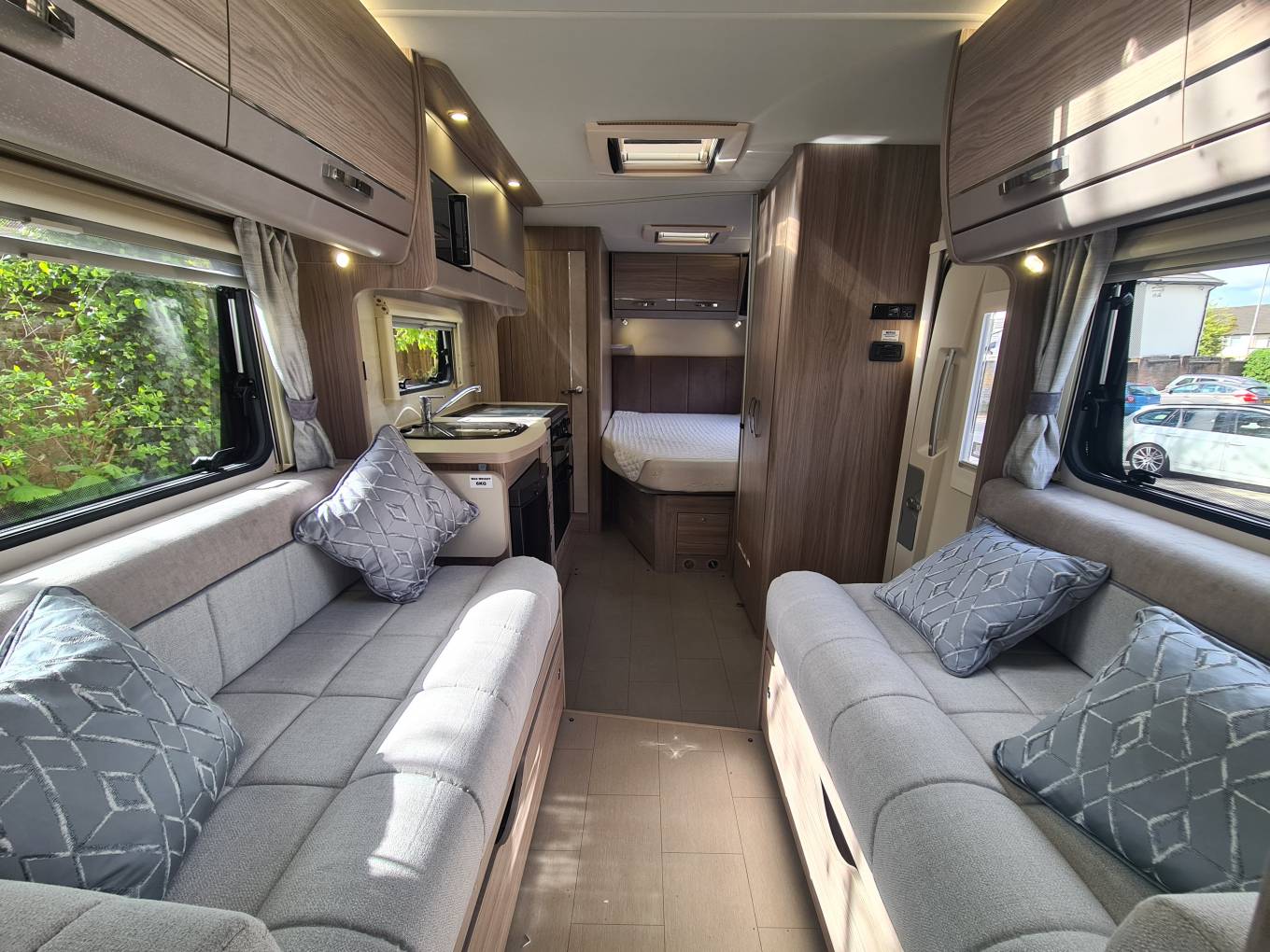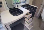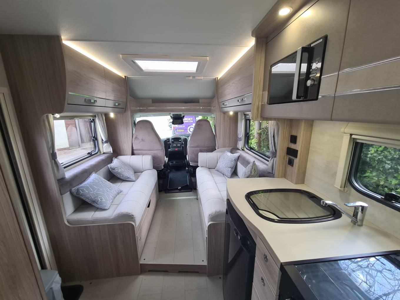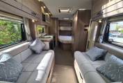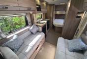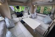 The dining and lounging area has large side facing sofas which quickly and easily assemble into a double berth. Underneath you will find folding fully belted travelling seats.