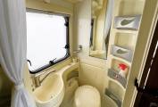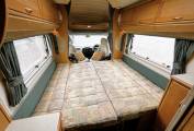 The comfortable lounge provides two long side sofas with storage under and further storage in the overhead lockers. Drop in the occassional table to create a useful dining area and this is complimented with the adjustable coffee table that sits to the side of one of the sofas. The sofas swiftly convert to beds with the option of two good sized singles or a huge double bed and there is a further sleeping space provided with the overcab bed.