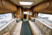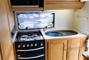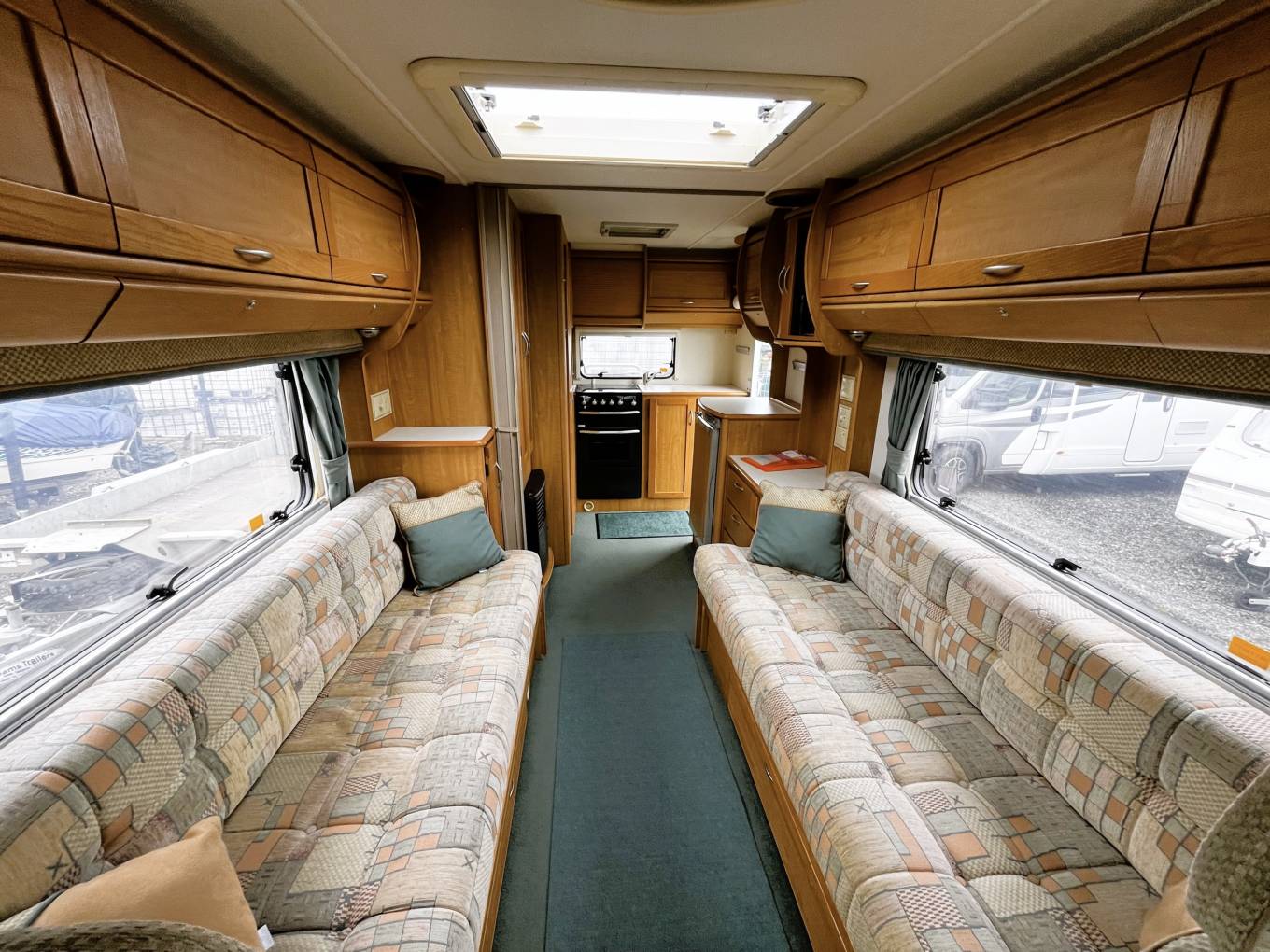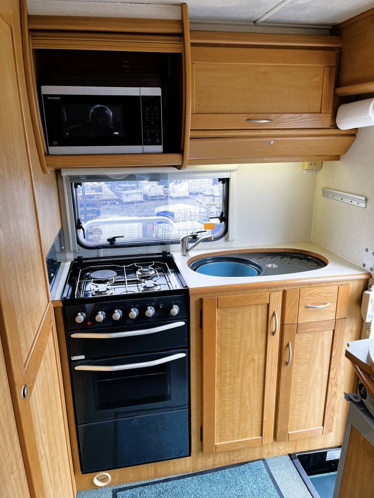 The rear kitchen has all that you need to rustle up anything from a simple snack to a full blown Sunday Roast. A full size oven and separate grill wth 3 burner gas hob and a hot plate along with a microwave oven gives you all your cooking options. There is a sink and drainer with cover and a 3 way under counter fridge along with plenty of storage space for all your bits and pieces. A TV cupboard with TV on extending bracket sits above further worksurface and storage. The built in washroom provides a flushing cassette toilet, sink and vanity and shower.