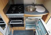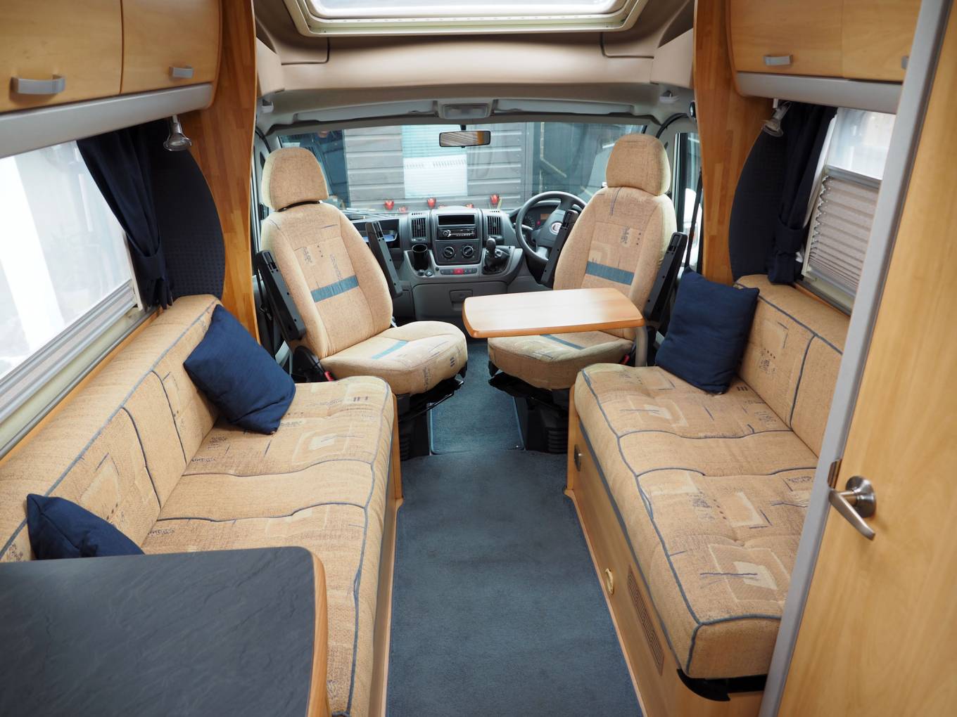 Essentially the layout comprises of a surprisingly roomy forward dinette capable of seating six for a social with the cab seats swivelled, midships dresser and wardrobe, while the the rear is a corner washroom and end kitchen.