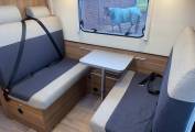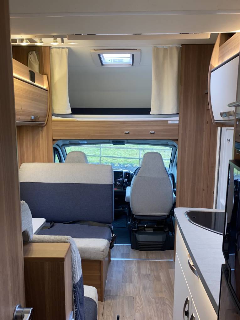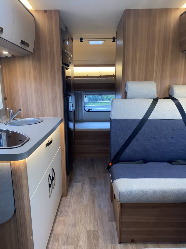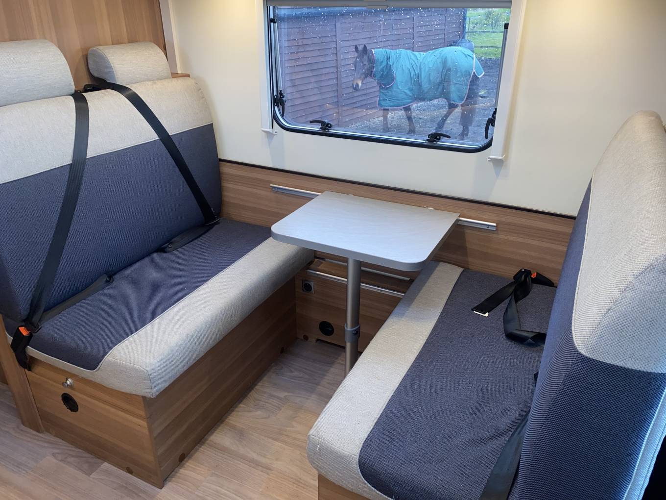 with a 3-burner gas hob, oven & grill and sink with a large fridge freezer. The dining area comes with 4 seatbelts and is light and