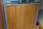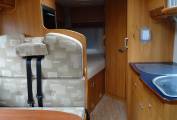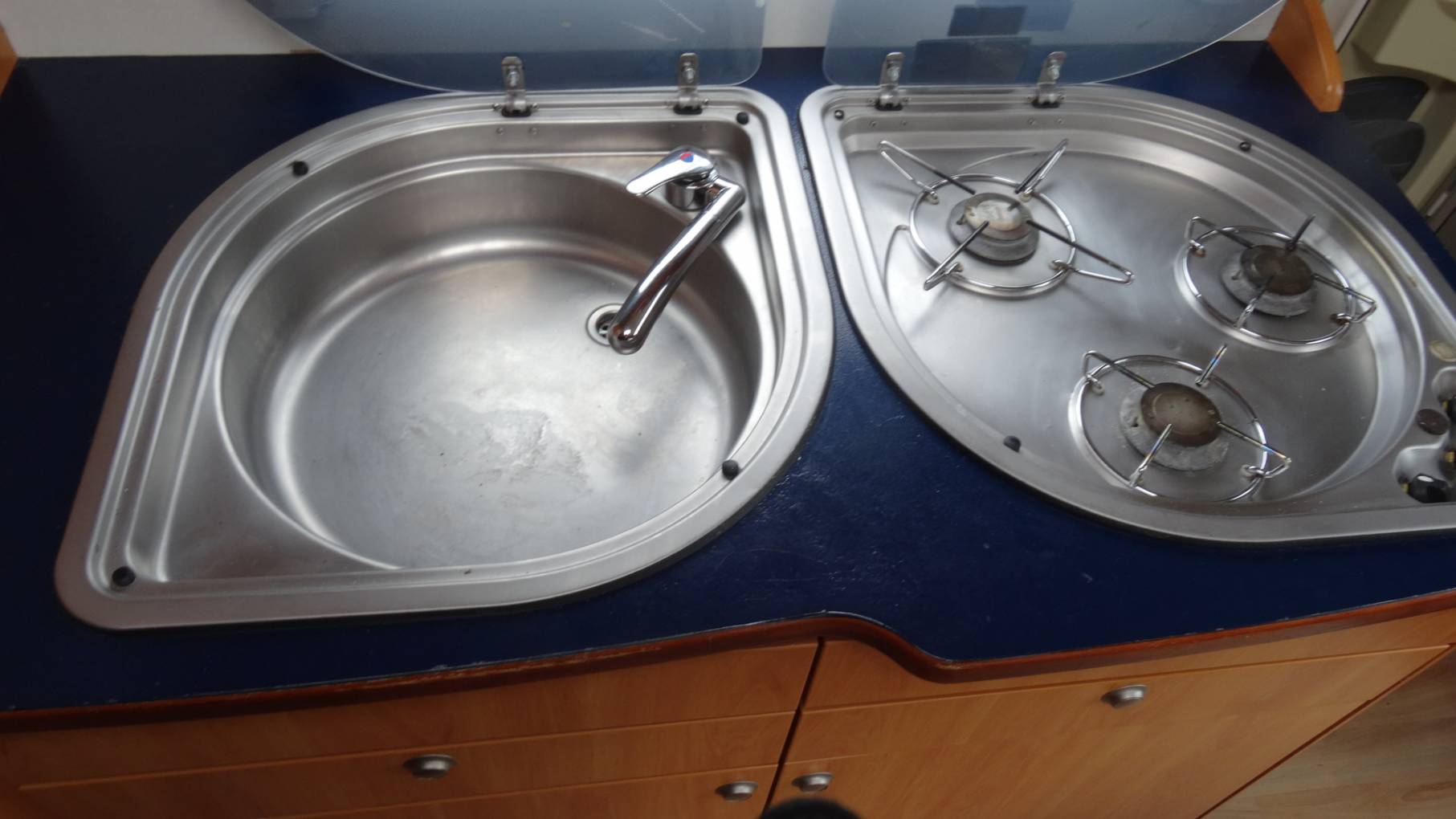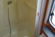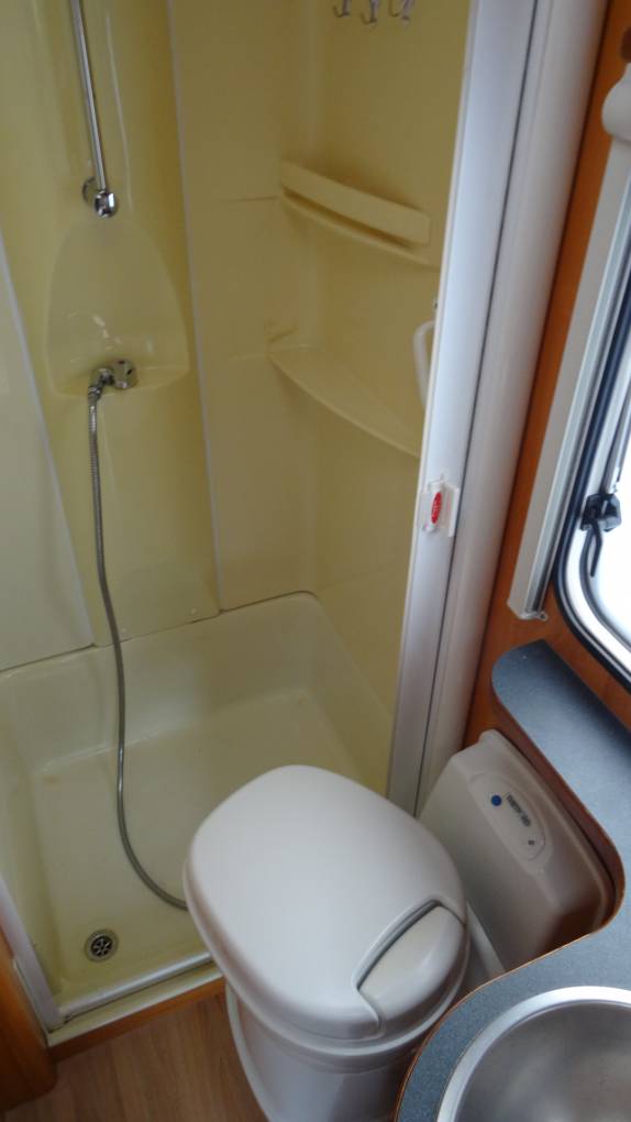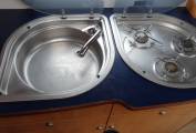 In the rear nearside corner is the washroom with a large separate shower at the end. Next comes a huge wardrobe and finally the 3-burner gas hob and sink with drawers below to the right of the habitation door. There are plenty of overhead storage lockers all around the van.