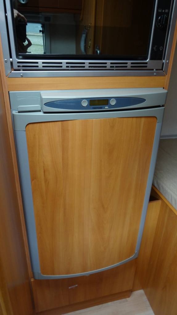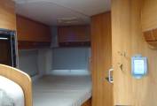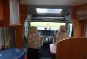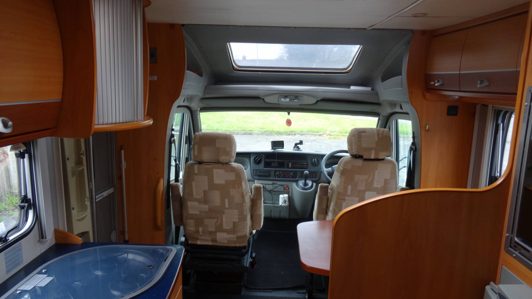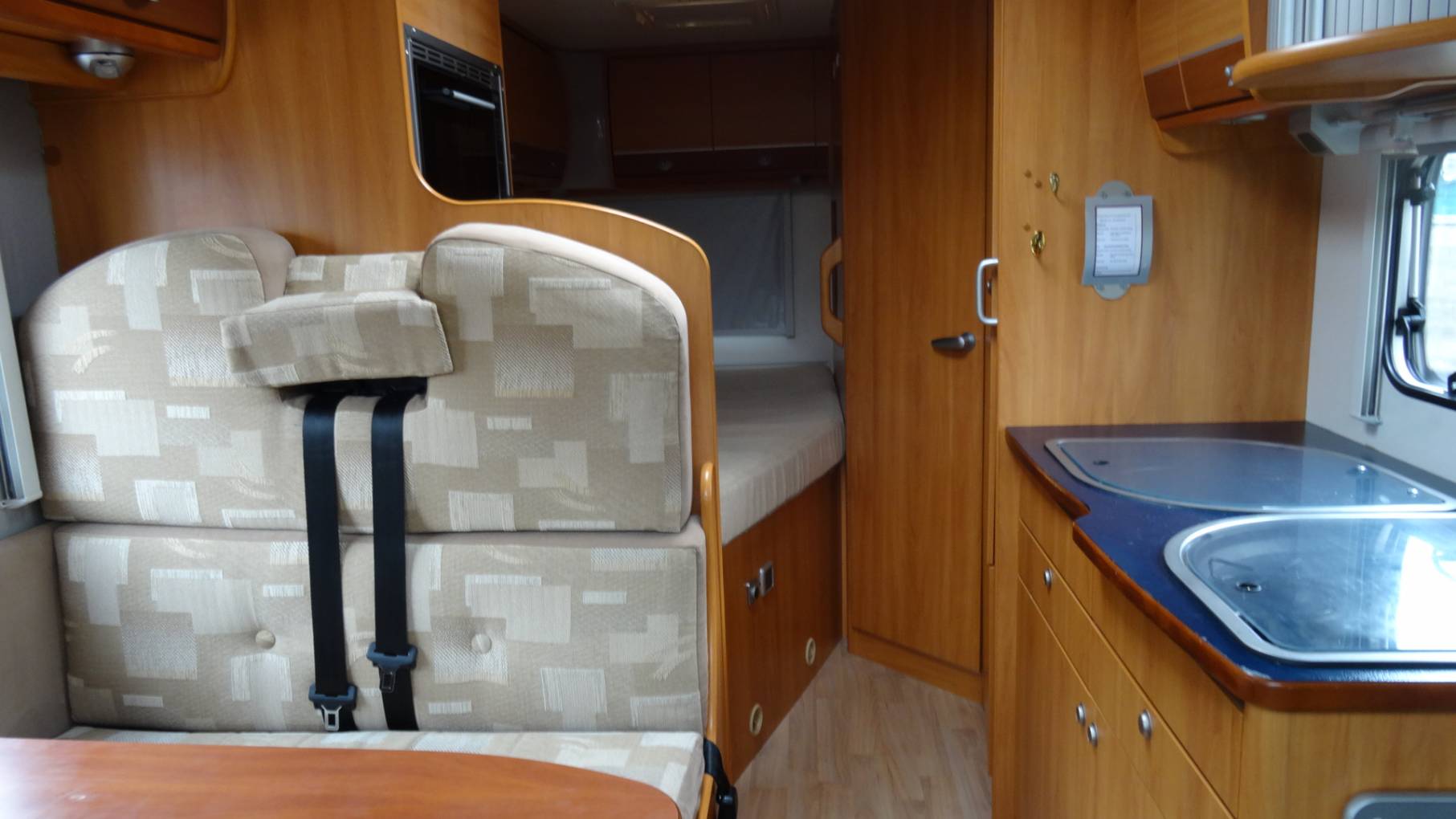 The habitation door is on the nearside and is fitted with a flyscreen. The swivel cab seats are immediately to the left and the windows are fitted with integral cab blinds. Behind the drivers seat is a dining table then a forward facing bench with two seatbelts. A small double bed can be made up here if required. Next come the good sized fridge with the oven sited above it.