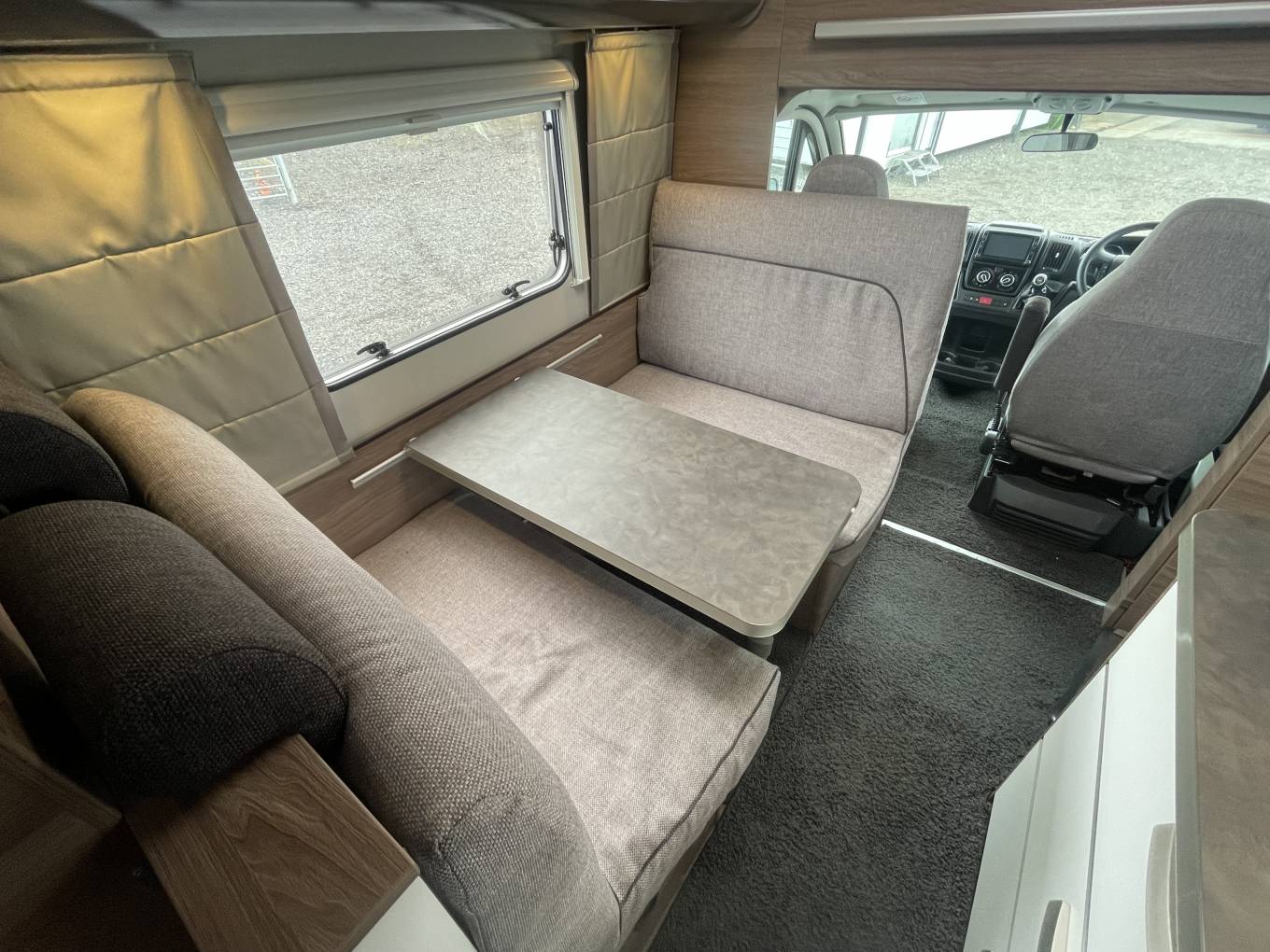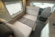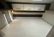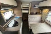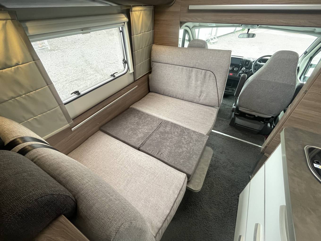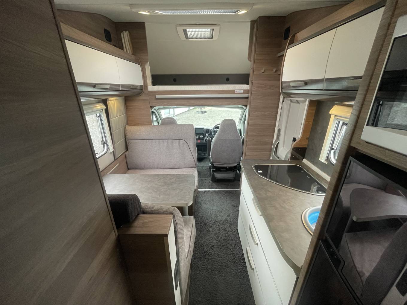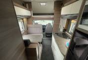 The first of the double beds is above the front cab seats that can be pushed out of the way for more head room.You have a double dinette behind the front seats to accommodate 4 belted passengers but also turn into a double bed at night. Towards the the rear you have the galley kitchen and bathroom with separate shower, toilet and sink opposite. At the rear you have a transverse double bed above the large garage.