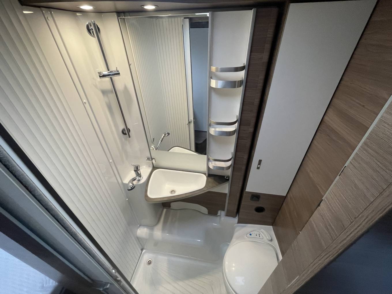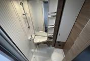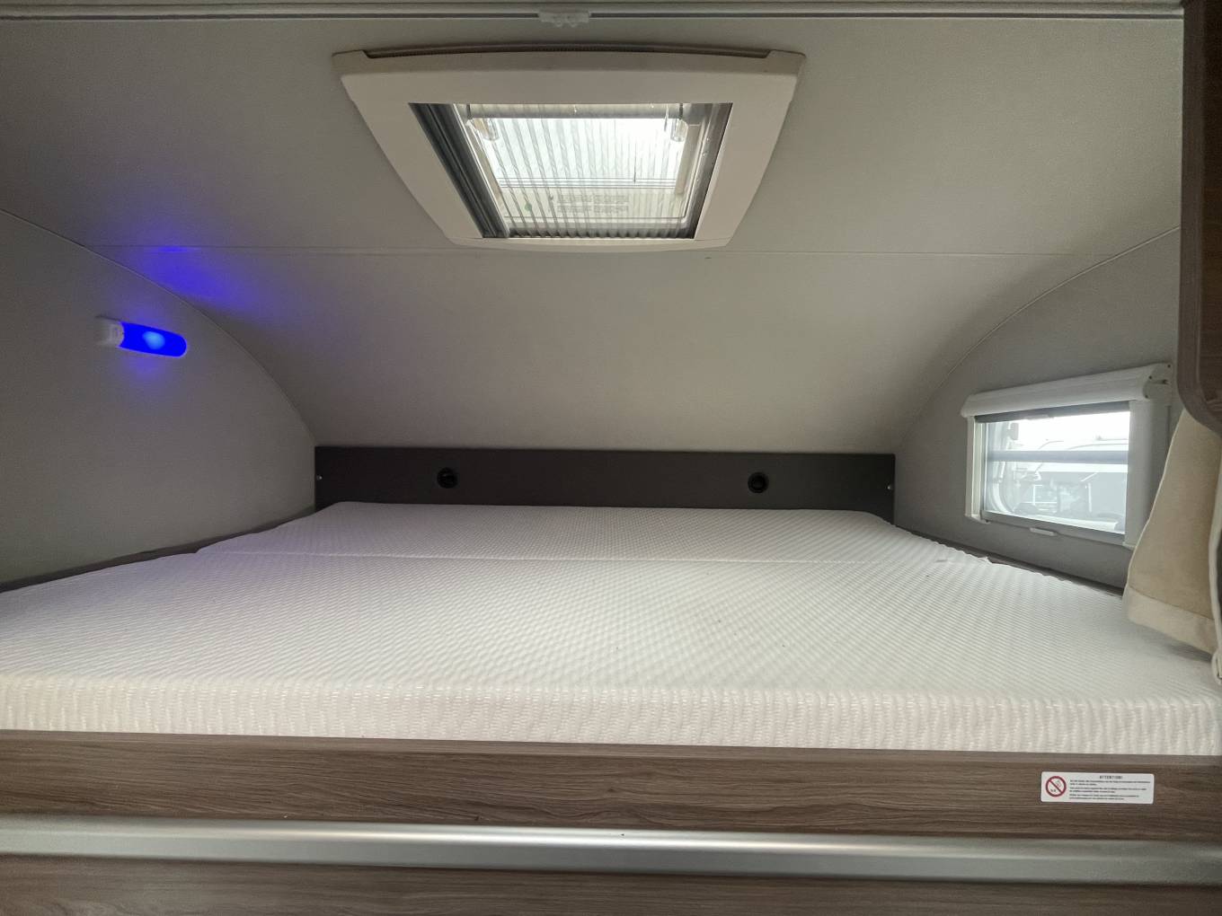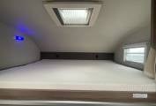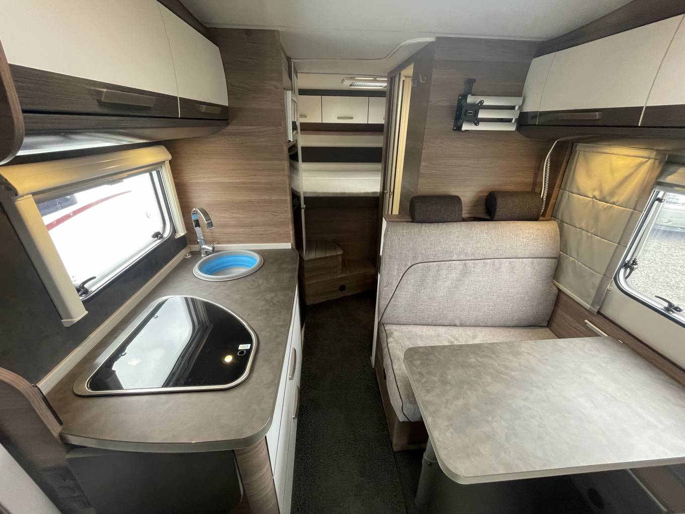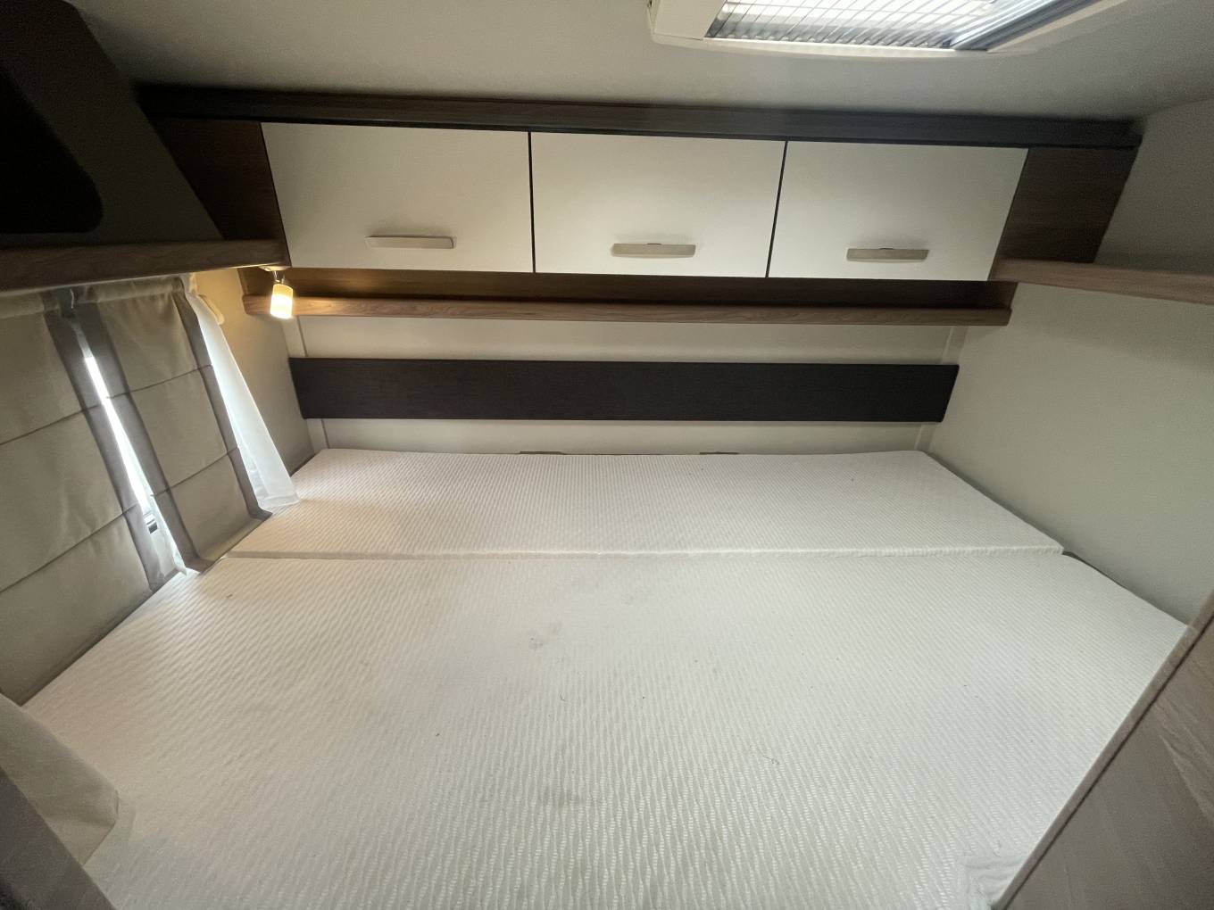 The first of the double beds is above the front cab seats that can be pushed out of the way for more head room.You have a double dinette behind the front seats to accommodate 4 belted passengers but also turn into a double bed at night. Towards the the rear you have the galley kitchen and bathroom with separate shower, toilet and sink opposite. At the rear you have a transverse double bed above the large garage.