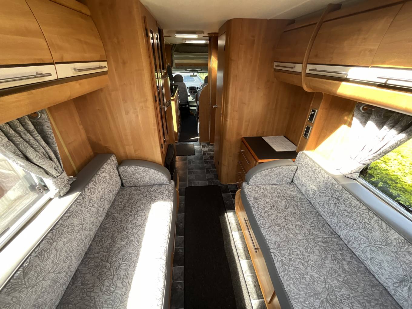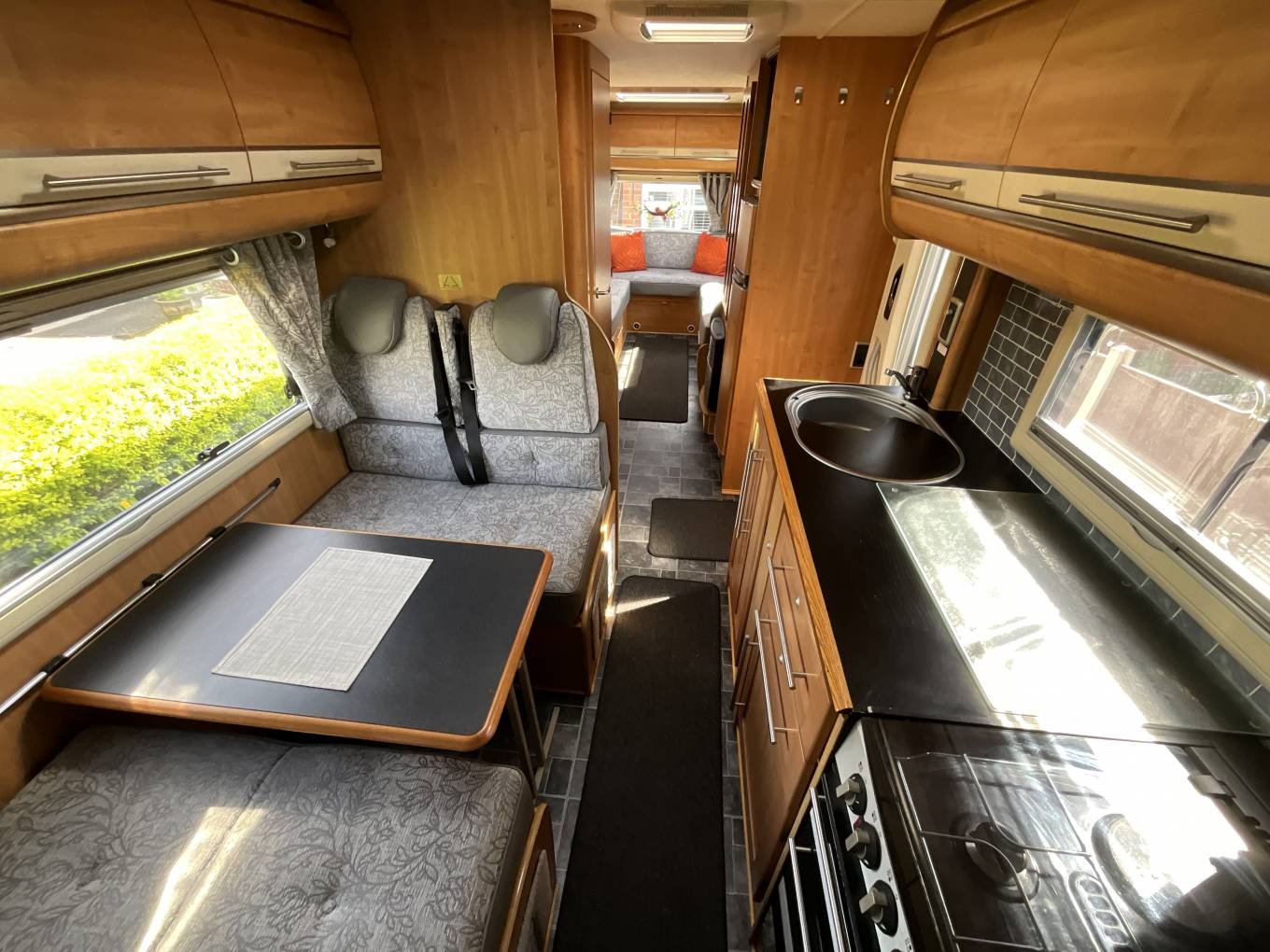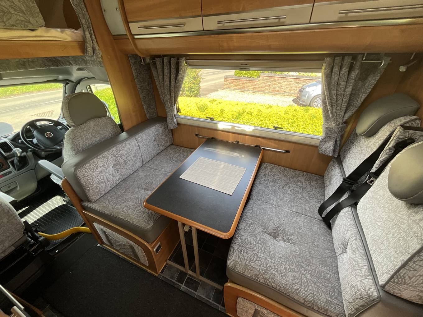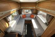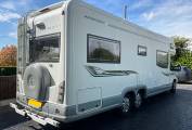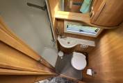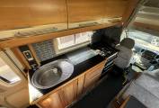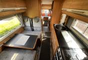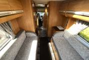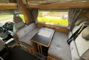 To the rear of this well designed motorhome is a large lounge which quickly converts to a double bed, comfortably sleeping 2. As we move forward we come to the washroom complete with cassette toilet, wash basin with mixer tap and separate shower. Adjacent to this is a large hanger wardrobe with a Trumatic gas/electric blown air heater below. Moving forward is the well equipped kitchen which includes a sink, large 3 way fridge freezer, oven, grill, 3 burner gas hob, 1 electric hob and ample storage. To the front is the light and airy dinette area which seats 4 comfortably and also converts to a double bed. Over the cab is another large double bed completing this 6 berth motorhome.