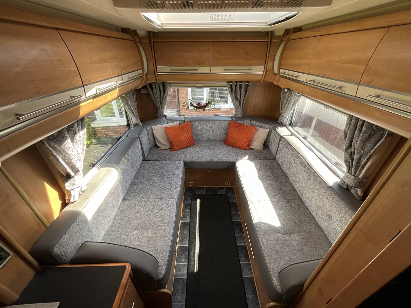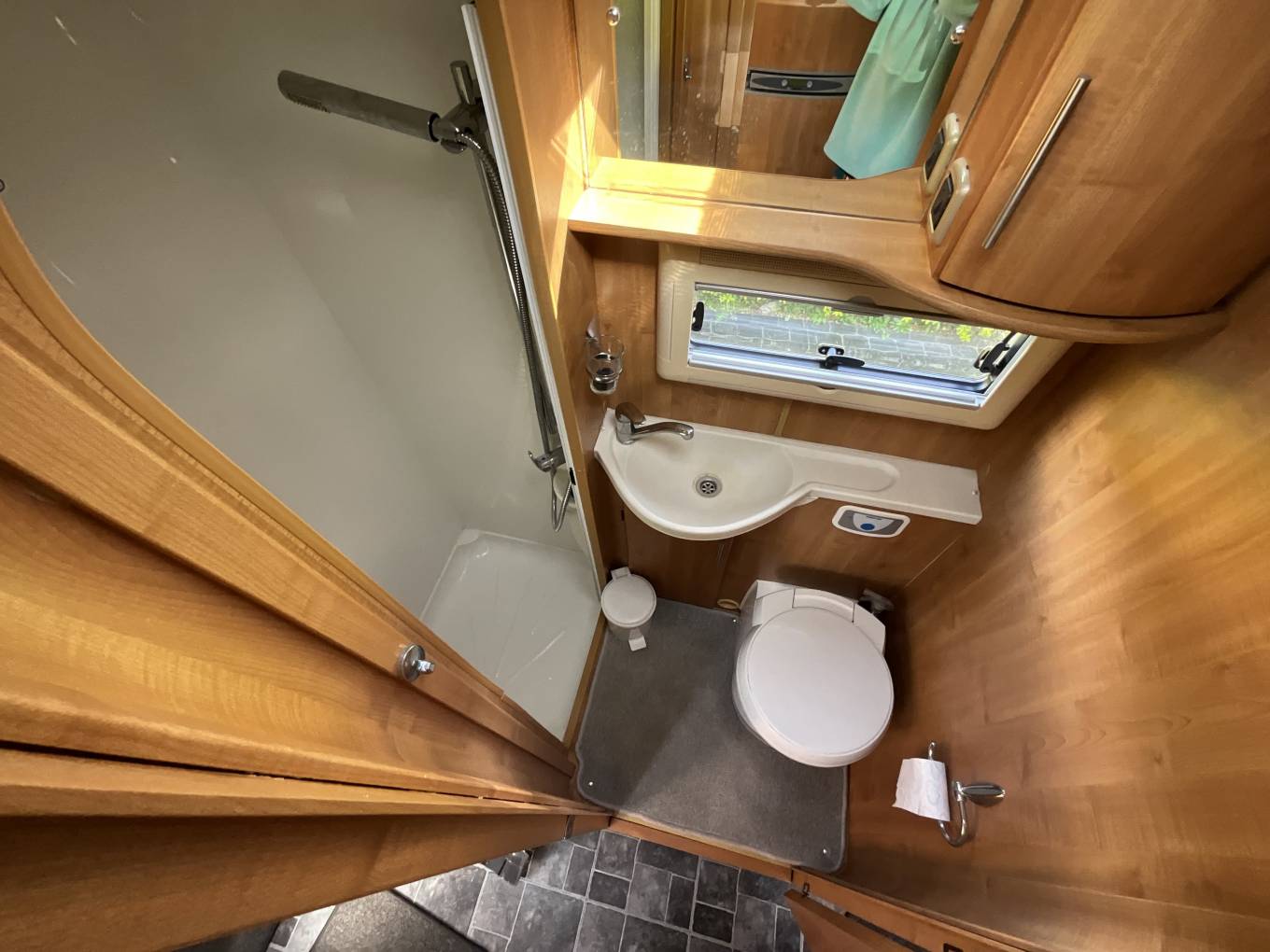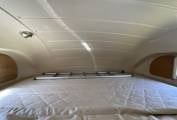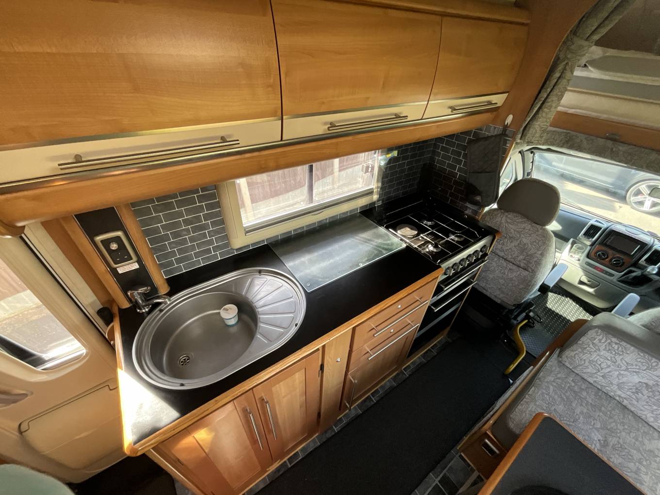To the rear of this well designed motorhome is a large lounge which quickly converts to a double bed, comfortably sleeping 2. As we move forward we come to the washroom complete with cassette toilet, wash basin with mixer tap and separate shower. Adjacent to this is a large hanger wardrobe with a Trumatic gas/electric blown air heater below. Moving forward is the well equipped kitchen which includes a sink, large 3 way fridge freezer, oven, grill, 3 burner gas hob, 1 electric hob and ample storage. To the front is the light and airy dinette area which seats 4 comfortably and also converts to a double bed. Over the cab is another large double bed completing this 6 berth motorhome.