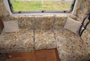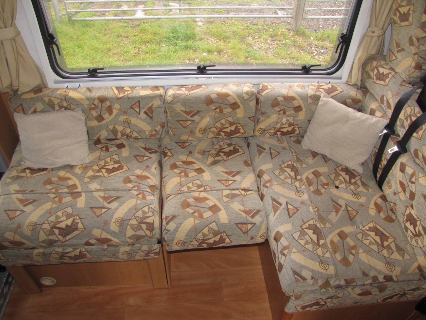 As you enter the habitation you have a lovely light interior with the L-Shaped lounge with fold away table to sit the family round. For additional seating you have the two captain swivel seats. You have two 3 point travelling seat belts to allow you to transport an additional two people. Opposite the lounge you have a full-sized wardrobe space that can store away the fold away table. This area converts to a full-sized double bed by night.