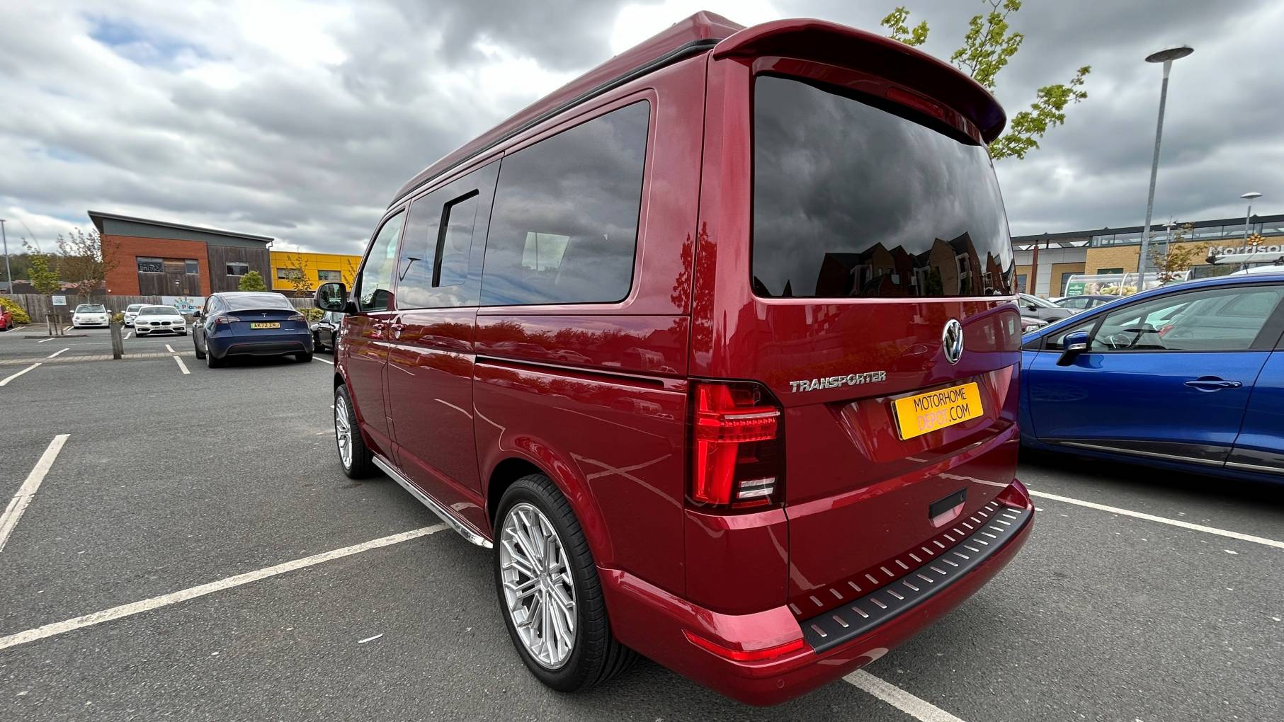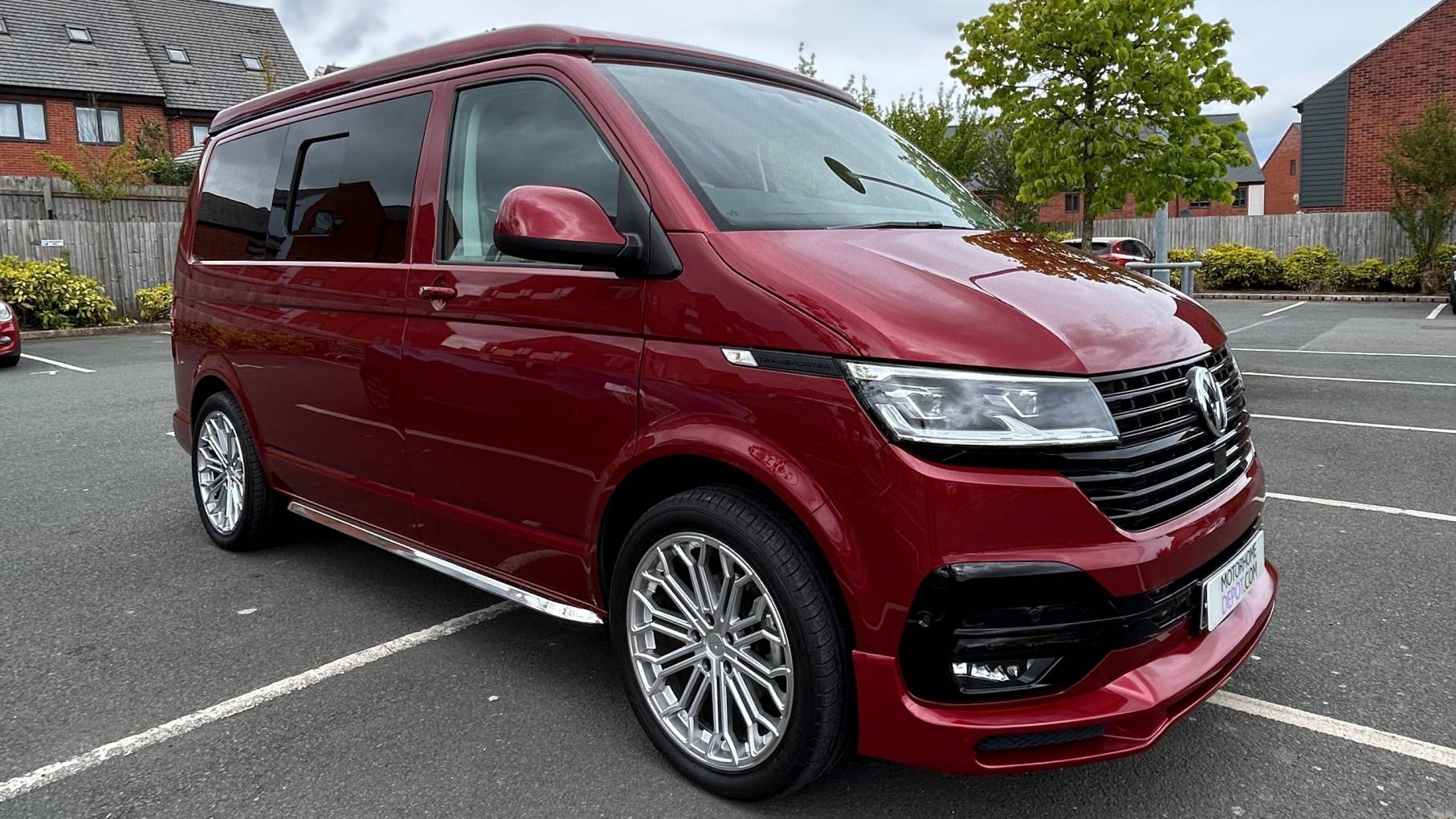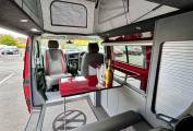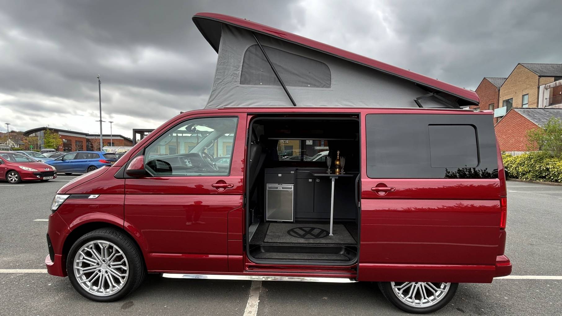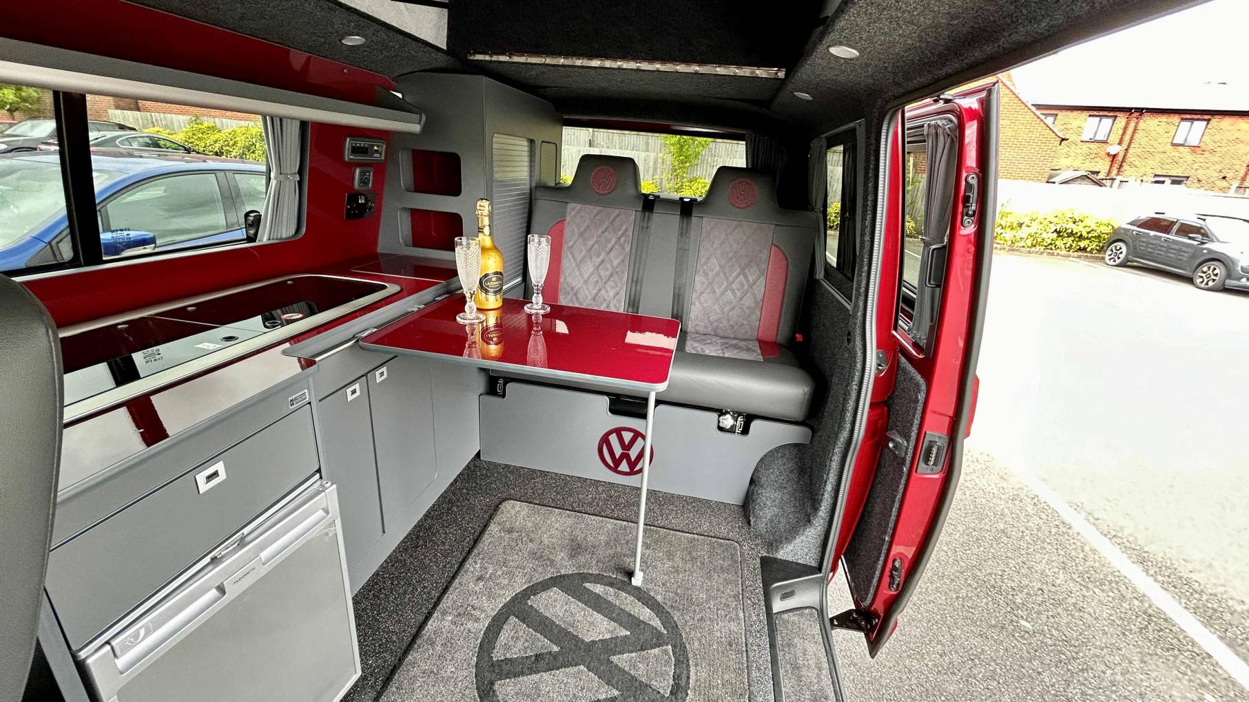 This striking 4 Berth with 4 seat belts comes in Fortuna Red with upgraded and unmarked Velare 20” Alloys and just 10,600 miles, 6 speed manual gearbox with the powerful 150Bhp engine and A DAB digital head unit with Bluetooth, Apple & Android Auto. The van has a Pop Top which provides the option for 2 to sleep in, with a rock and roll bed below making this into a 4 Berth Camper.