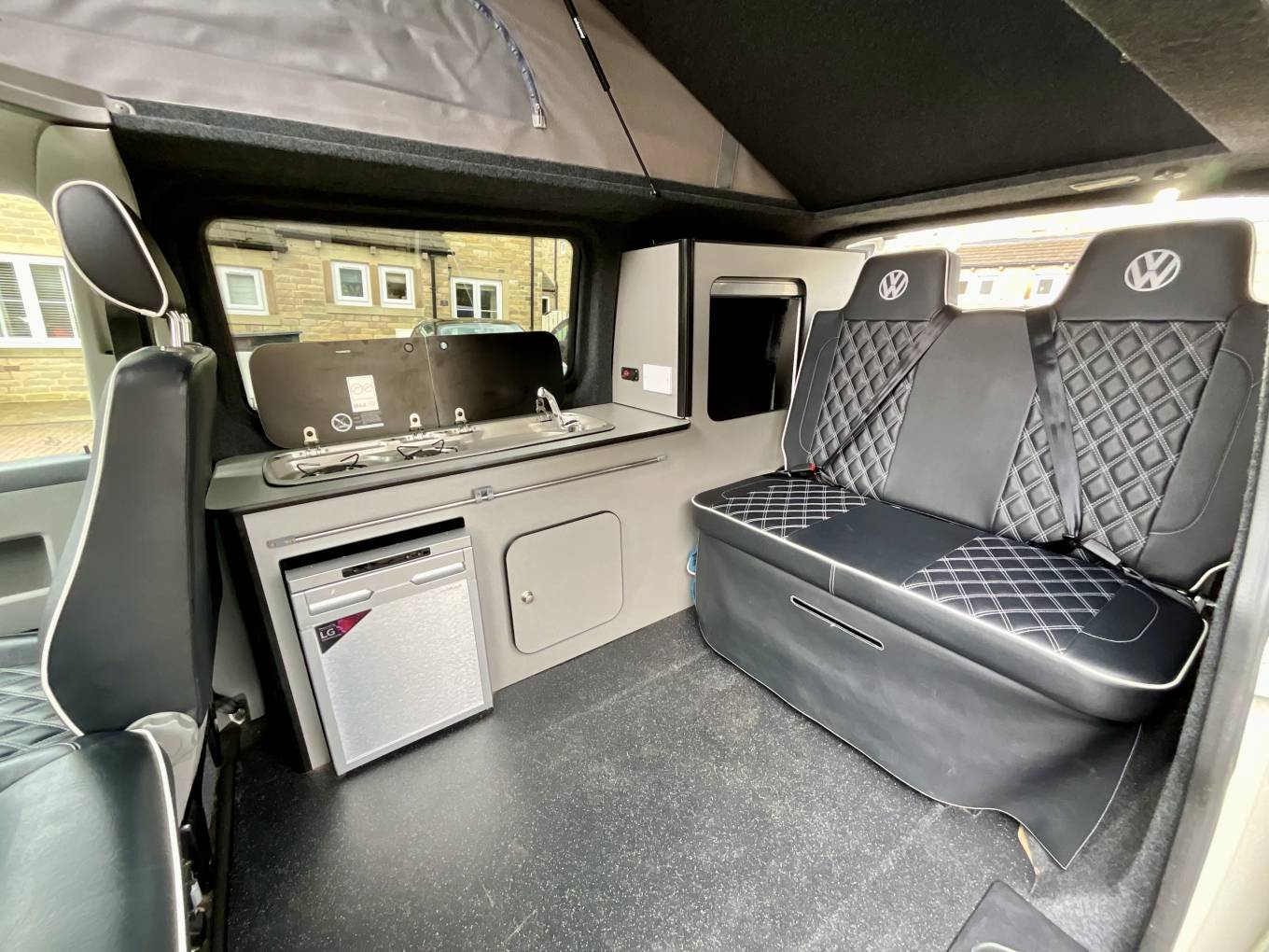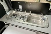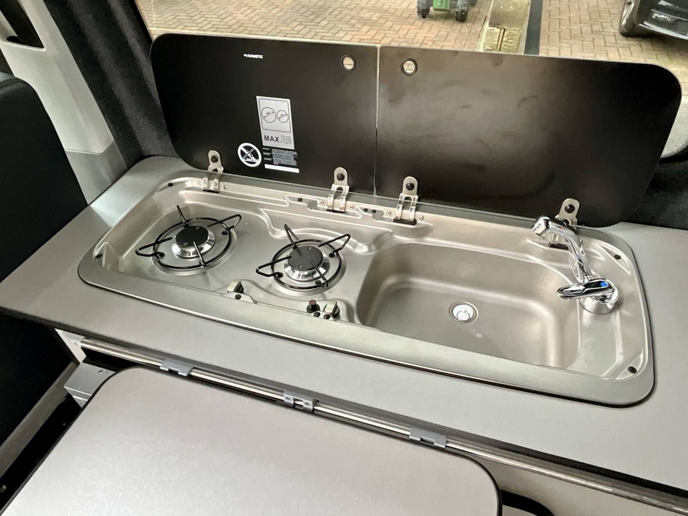 Below, the kitchenette is fully equipped with gas hobs, tap with water pump, and 12v Adventurer fridge with freezer compartment.