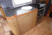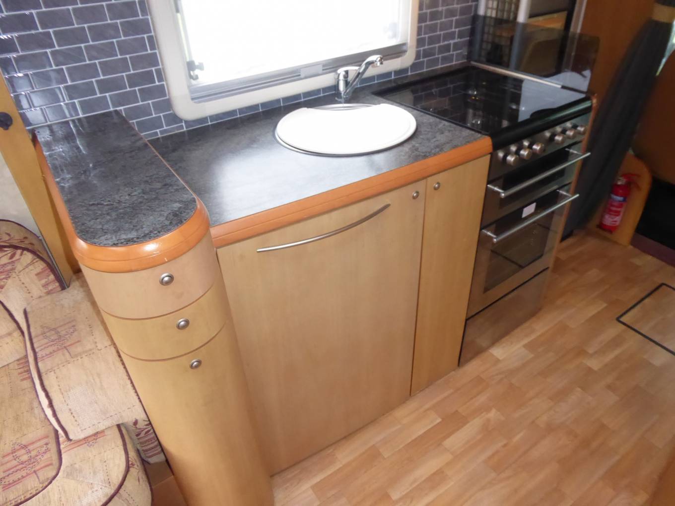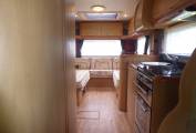 Beyond the nearside habitation door there is a central kitchen with a hob with 3 gas burners and an electric plate, an extractor fan, an oven, a grill, a fridge with a freezer box, and a sink.