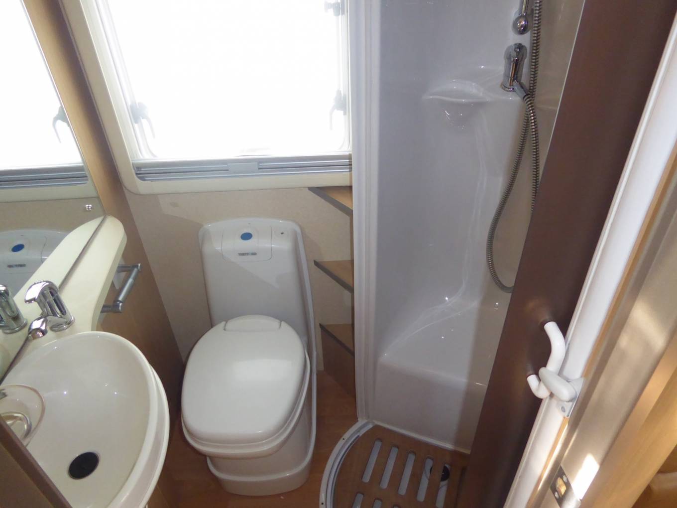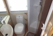Progressing through the vehicle there is an offside bathroom with a toilet, a hand basin and a screened shower. Opposite is the habitation door and a wardrobe.