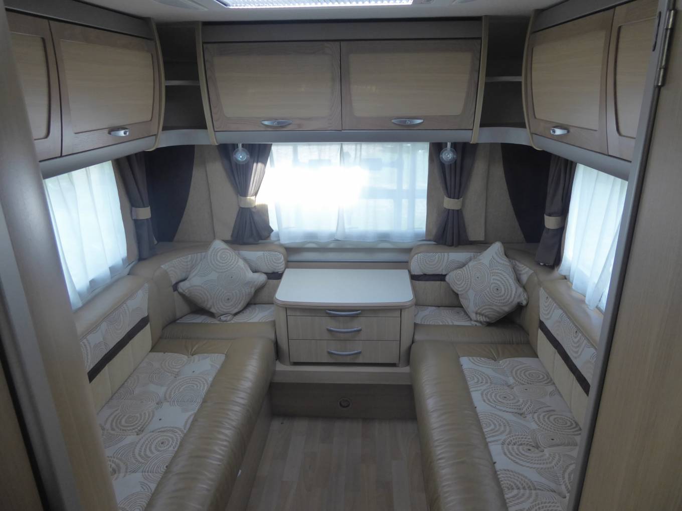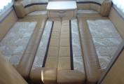 At the rear of the vehicle is a second dining/leisure area with opposing side sofas separated by a dresser shelf with drawers. This seating can be converted into another transverse double berth.