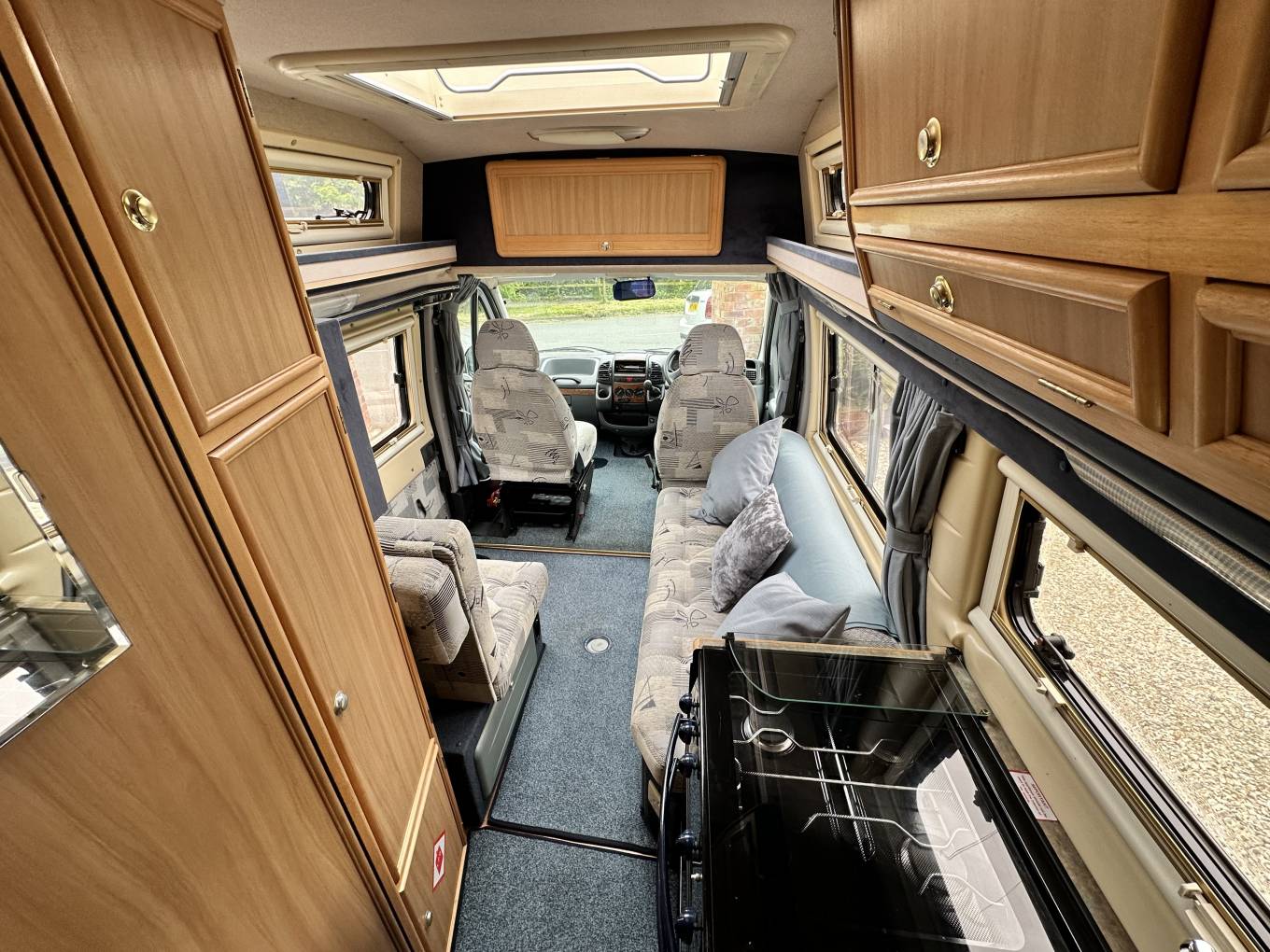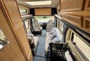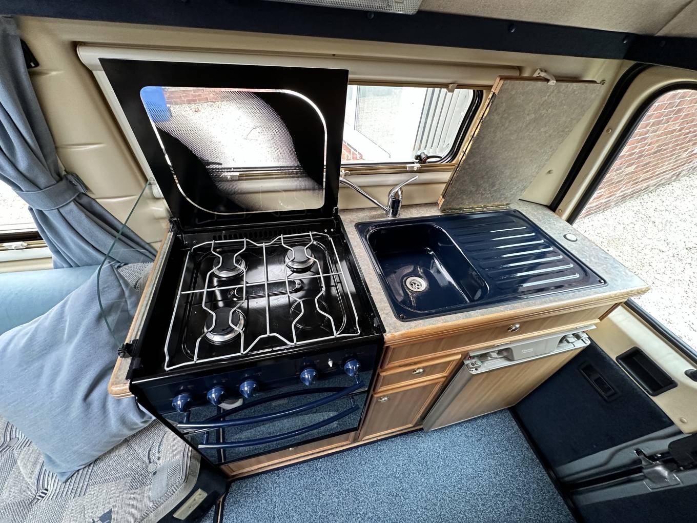 Starting at the rear of this compact camper van you will find the kitchen area. This is very well equipped and features a 3 ring gas hob, grill, oven, sink and a 3 way fridge. Adjacent to this is the washroom area that includes a toilet, space saving drop drown hand wash basin and a shower. To the front, we have a good sized and comfortable side bench as well as a single forward facing seat which also includes 3 point seat belt for that extra passenger. This area also converts into a good sized double bed or for a single sleeper can be converted into a single bed with the help of the swivelling seat.