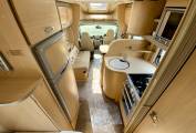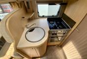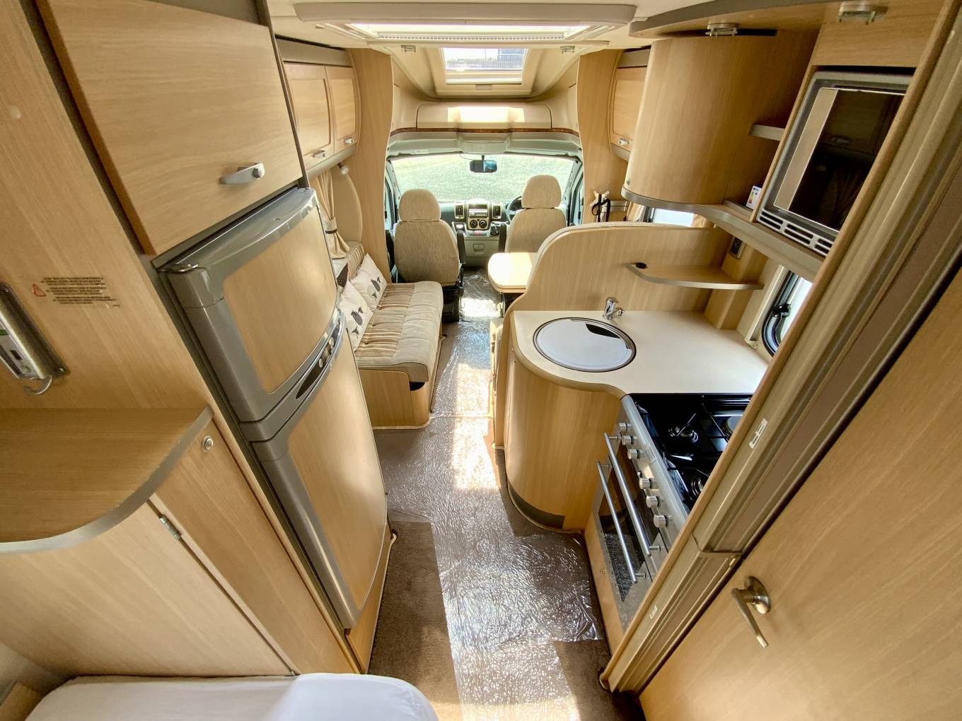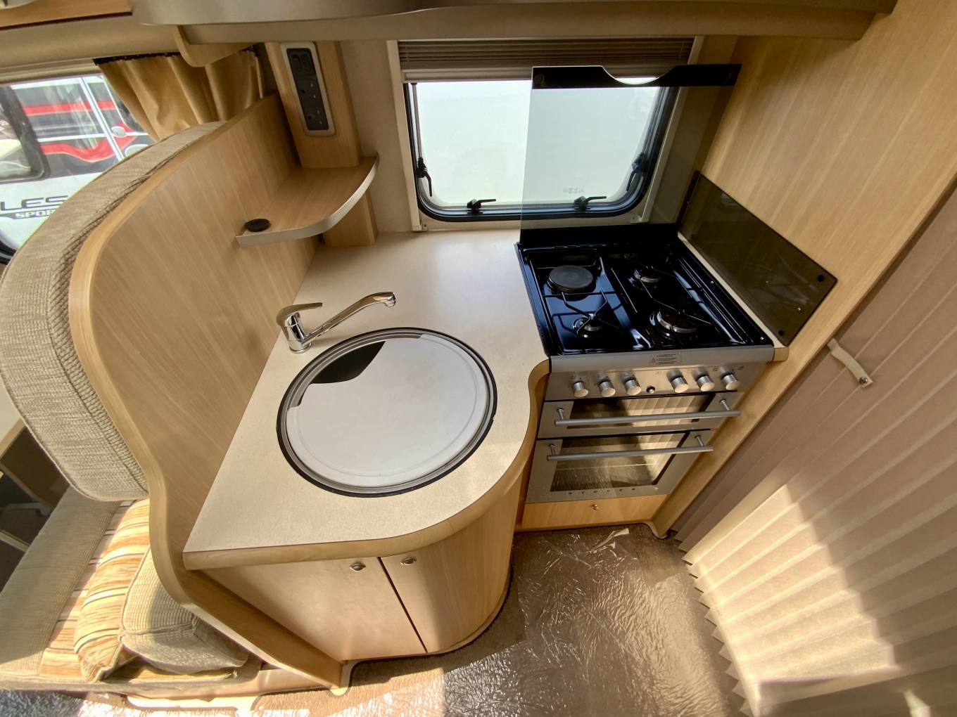 As you step through the habitation door, you are welcomed into the well equipped kitchen featuring a circular sink with chrome mixer tap, three gas burner hob along with an electric hotplate, Thetford gas grill and separate oven, microwave and a large 3-way powered fridge with separate freezer unit.