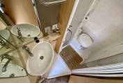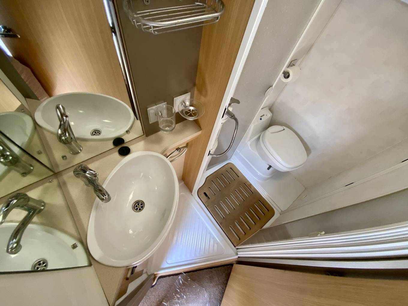 Next up is the generous sized corner washroom which has an integral shower cubicle with a double set of bi-fold doors, washbasin with a mixer tap, a cassette swivelling toilet, a vanity cabinet and mirror. Adjacent to the washroom is the French fixed double bed with side window, reading lights and great storage underneath, which can be easily accessed from inside or outside the motorhome.