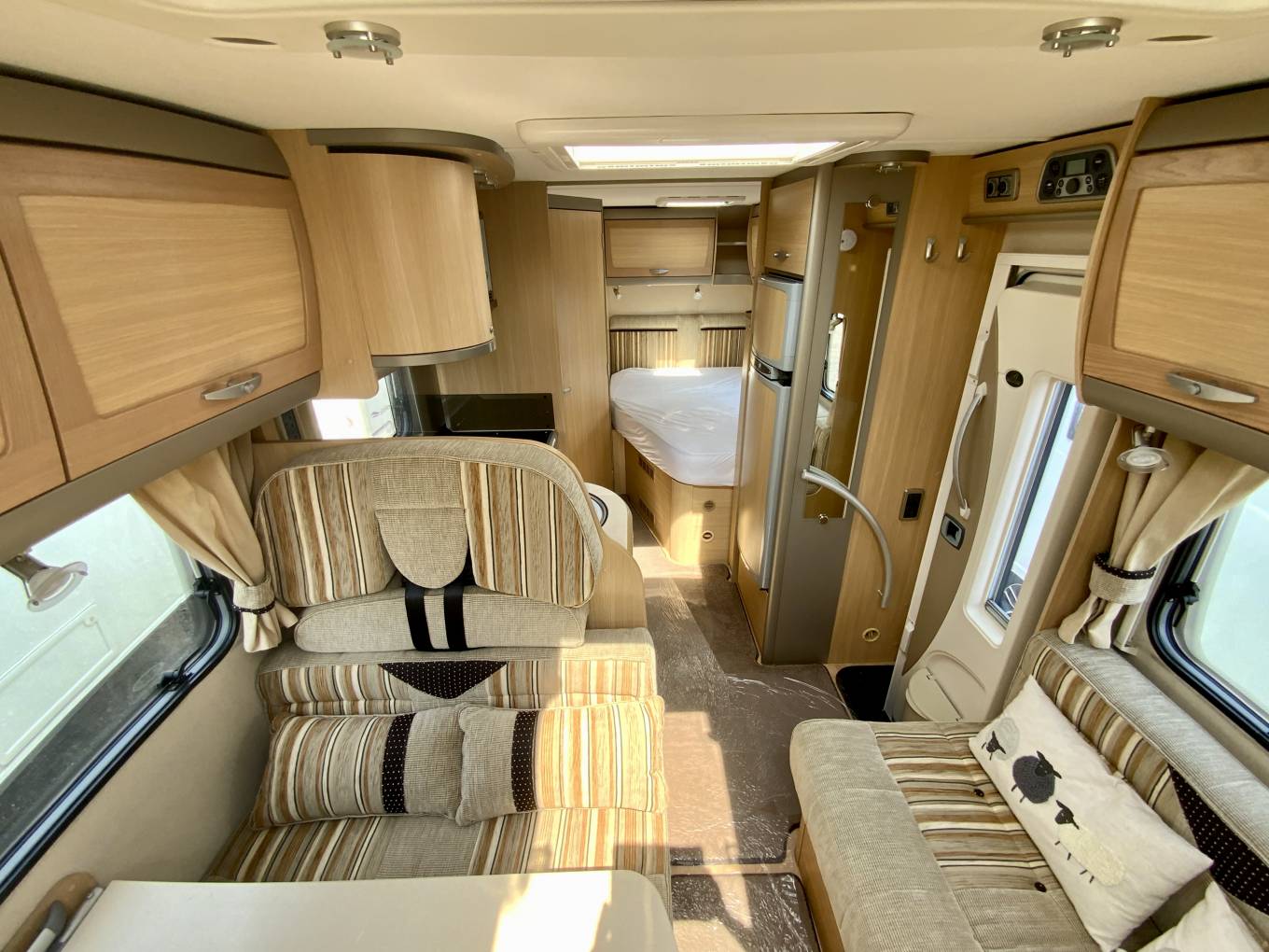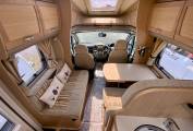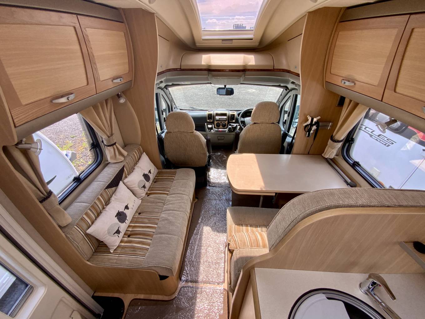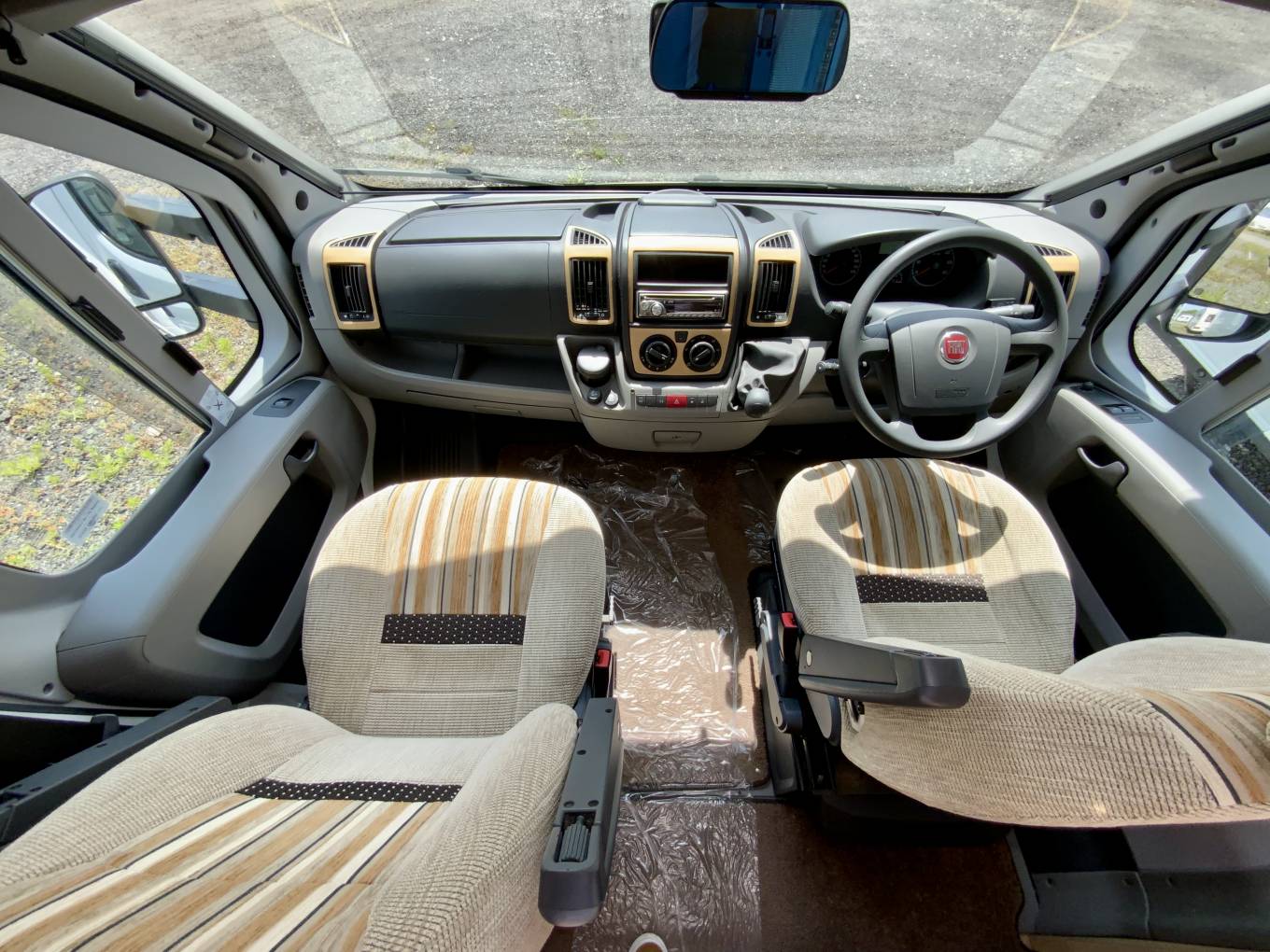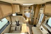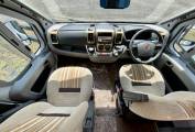Moving forward you will find the comfortable lounge and dinette area which has a side sofa that can easily be made up into a double bed in the evening. There is upper lockers and under seat storage also available. There is a good-sized and extendable dining table, with more storage available above the cab area. The front cab passenger and drivers seats both easily swivel round to face the living space, offering additional seating for either relaxing or entertaining.