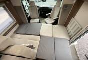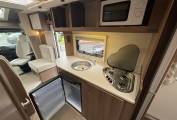 The Lounge area is bright and comfortable, courtesy of the large panoramic sunroof extending from the cab plus a Heki roof light this comfortably seats up to 5 adult diners when utilising the Swiveling Captains Chairs. This area also converts into a double bed and has the two forward facing travelling seats with 3 point seatbelts.