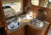 L-shaped kitchen with 3 burner hob, 3 way fridge, small oven, sink with abundant storage beneath.