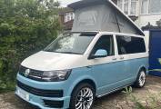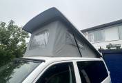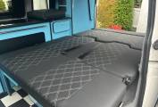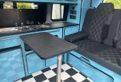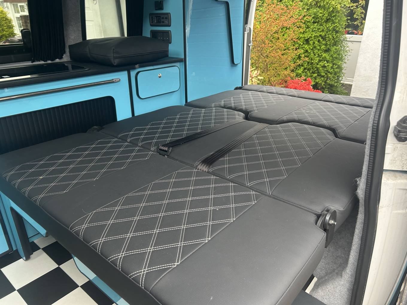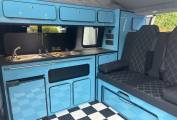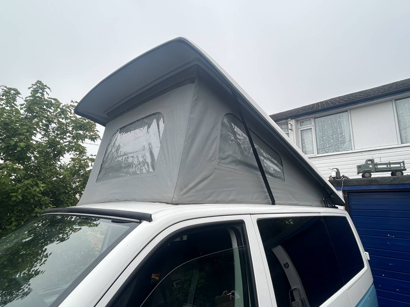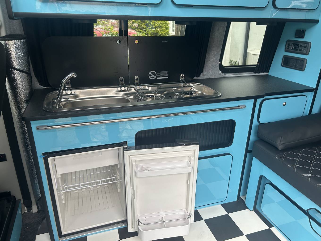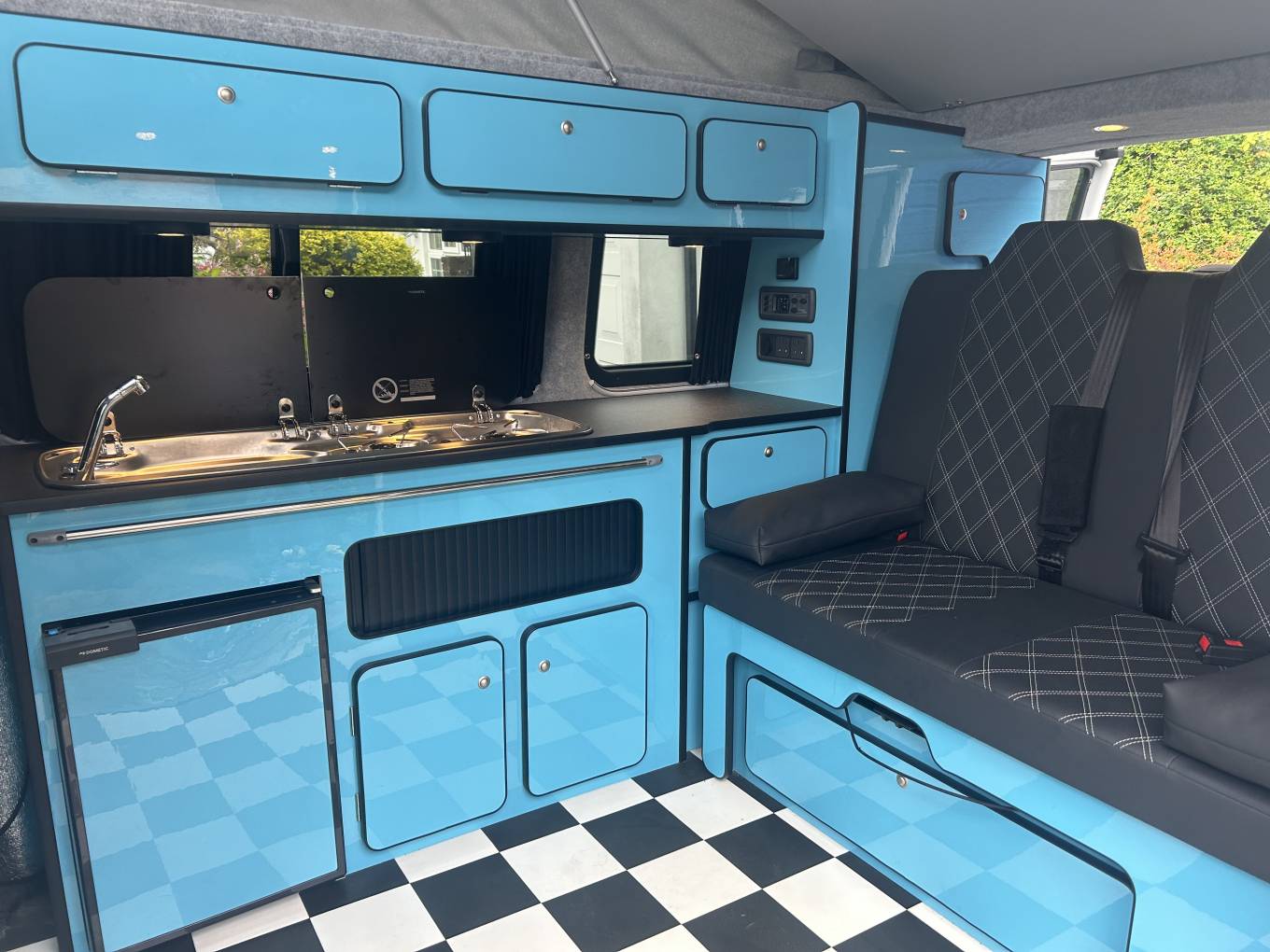 The camper comes with a rotating double front seat and 5 travelling belts in total. It has all the usual features of a well equipped camper including rock and roll bed, 12v/240v Fridge with Ice Box, gas hob with 2 burners, cold water sink and LED lighting. The VW campers are great for sleeping in with the rock and roll bed providing one double and with another double in the Pop Top roof. The camper comes with an underslung water tank and also has electric hook up.