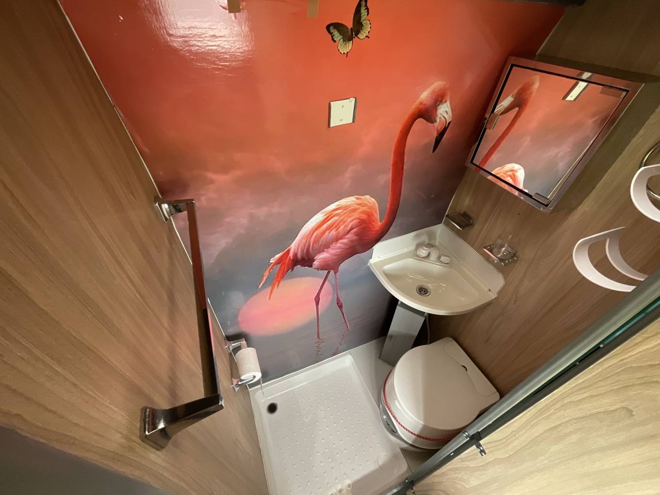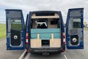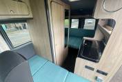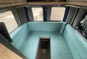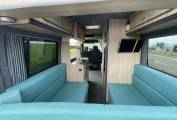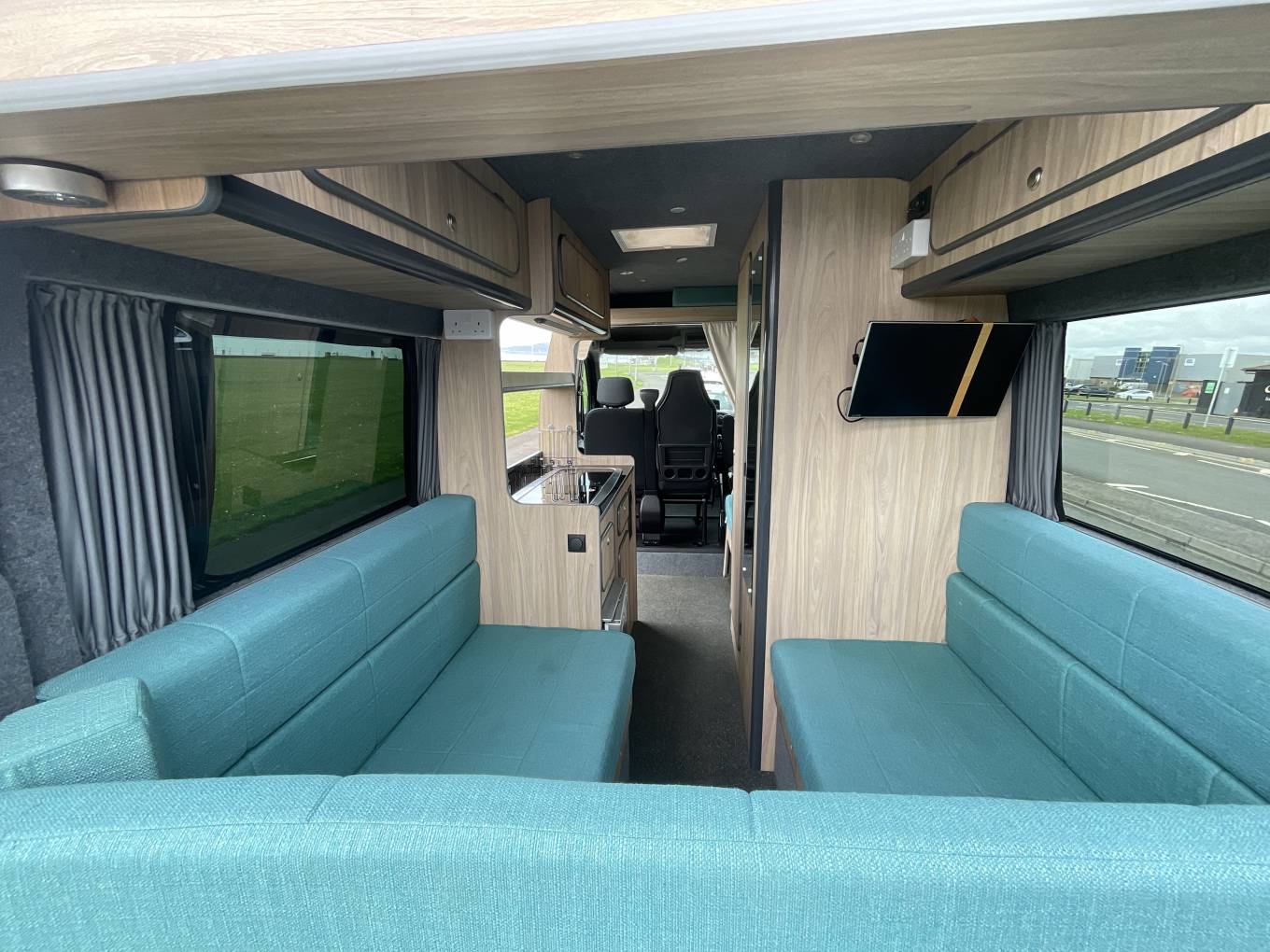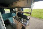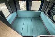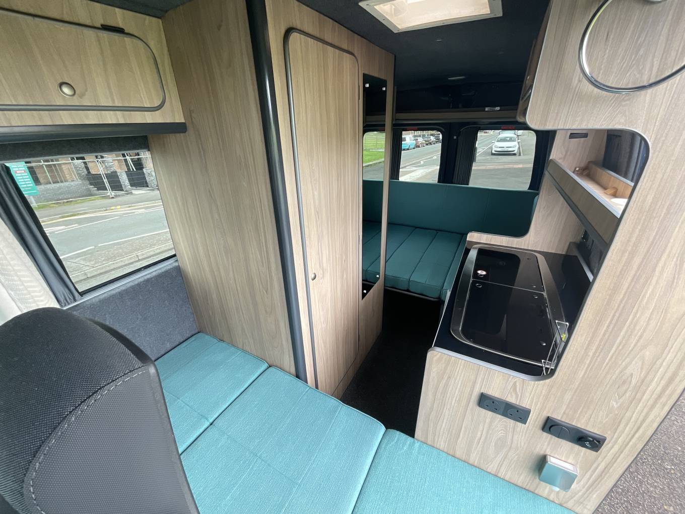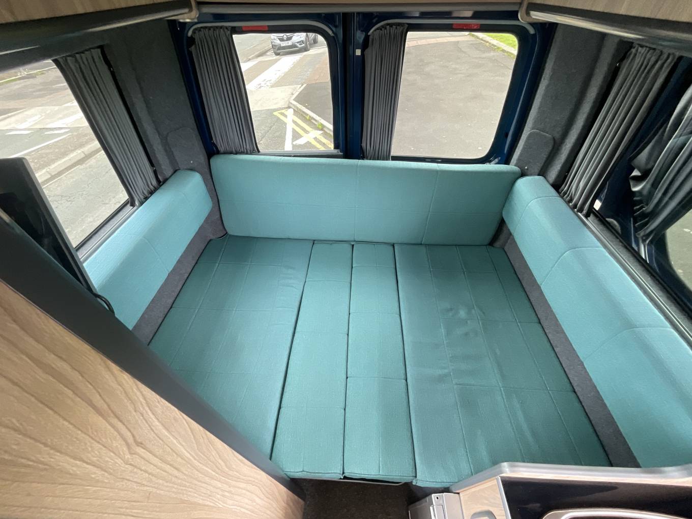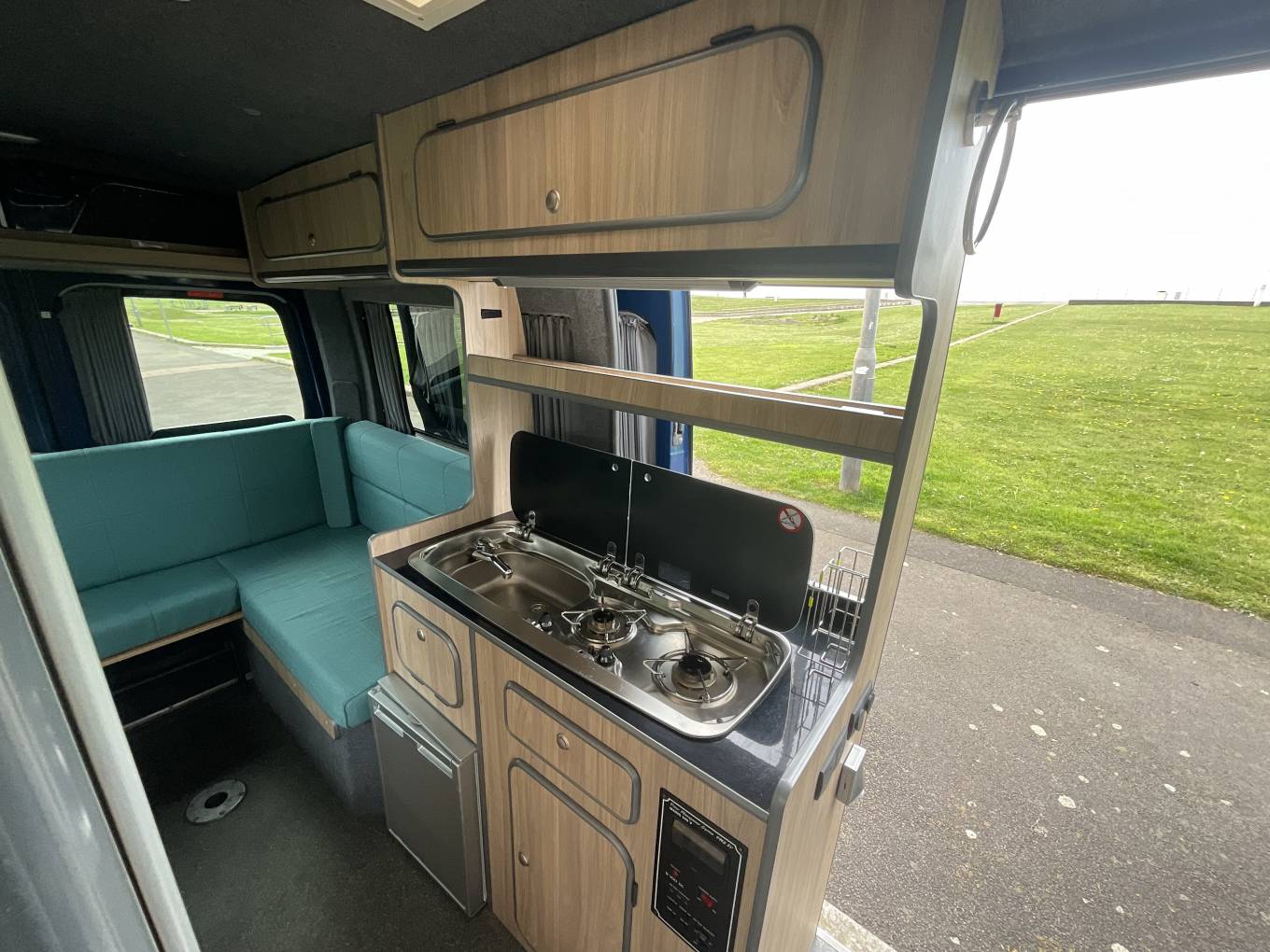 The van has been converted with a rear U shaped lounge which converts into a large transverse double bed. The front single seat pulls out to create an additional single bed and has the Propex hot water heater stored underneath. The kitchen area has a combined twin gas hob and sink with a hot and cold water mixer tap. Under counter compressor fridge with freezer compartment, cutlery draw and numerous cupboards. The washroom has a corner sink with extendable tap to use as a shower, Plastic shower tray with drain, porta potti and a vanity unit. 12v Avtex tv included in the sale with universal mobile aerial.