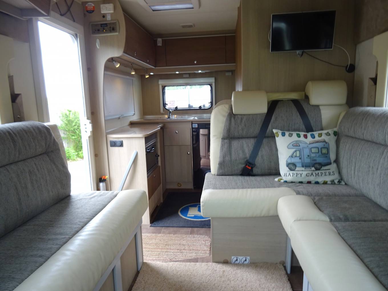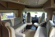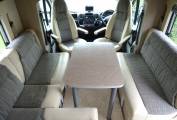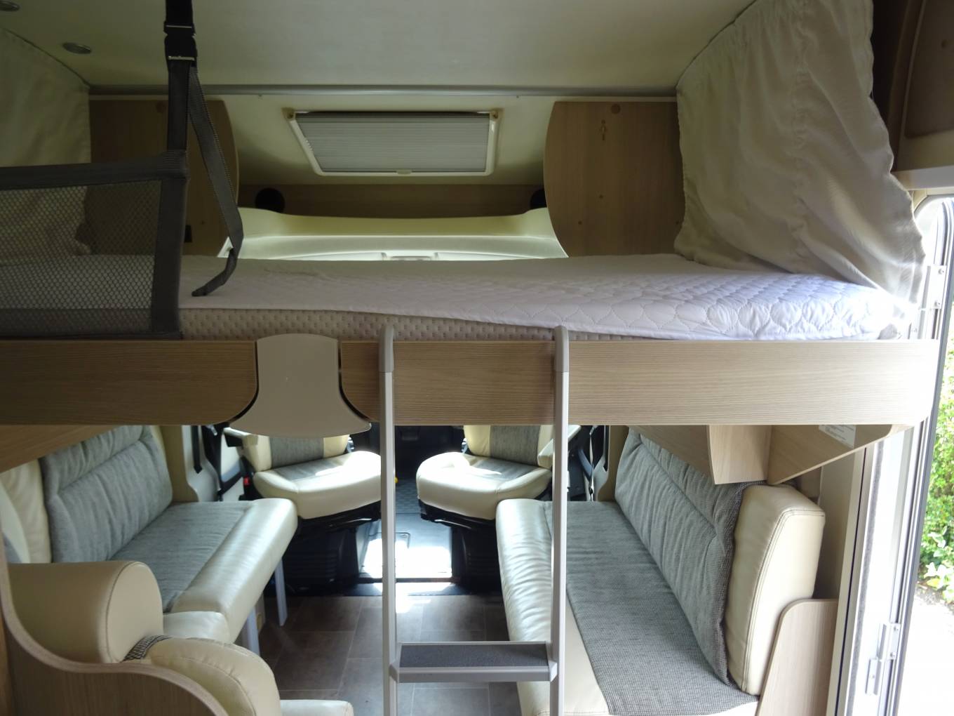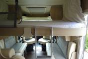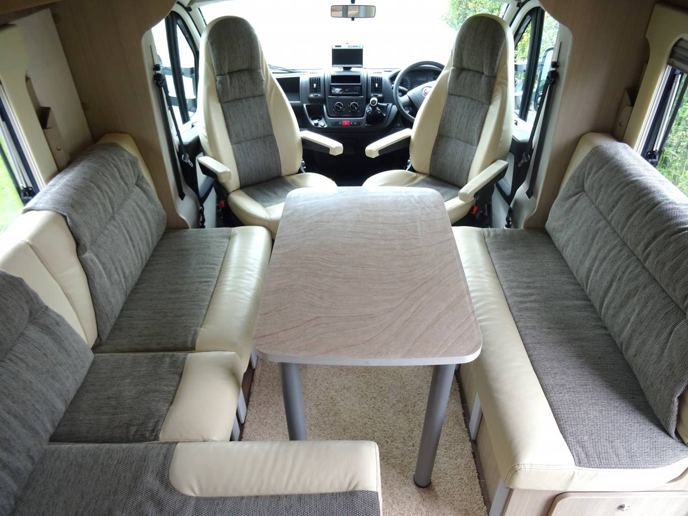 In the lounge/diner area the owner has taken a common decision and removed the fixed table and instead opted for a table that can be stored away. With both cab seats swiveled this gives us an unusually large and spacious area for such a small motorhome. Above is a manual pull down double bed with side fitted storage units.