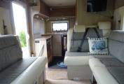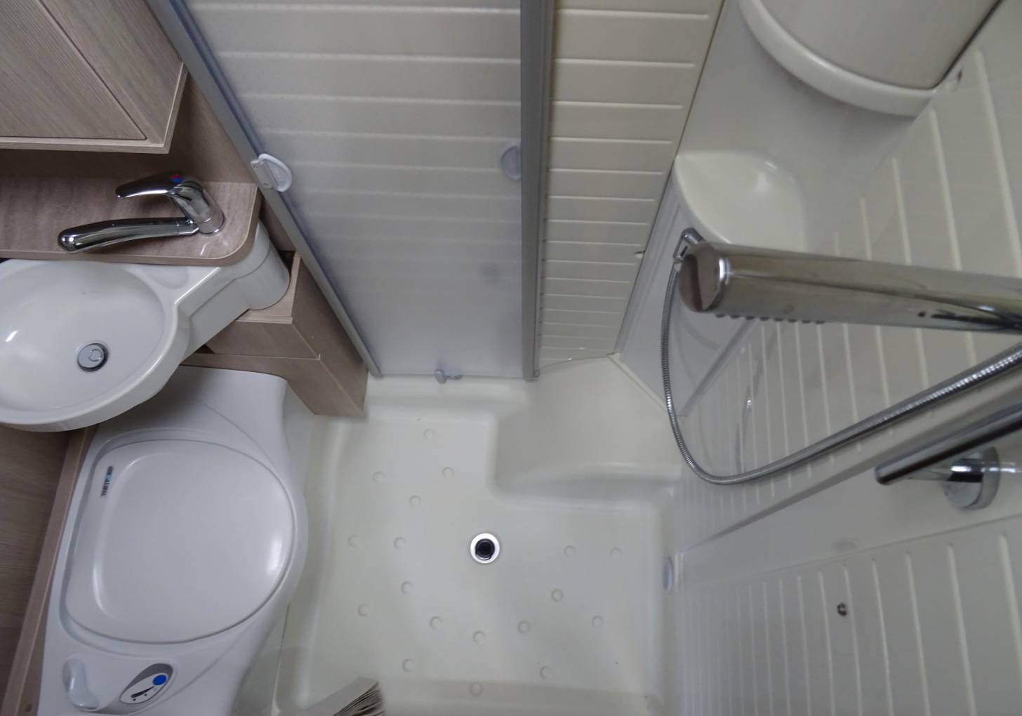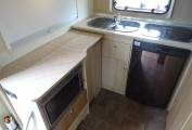 At the rear the L Shaped full appliance end kitchen comes into its own due to the huge work top area giving us maximum practicality. There is a 3 way Dometic fridge with freezer box, 3 gas burner hob, Smev oven/grill, stainless steel sink with mixer tap and good all round storage. Also at the rear is the integrated washroom with electric flush bench toilet, slide out basin, shower, curtain, solid bi-fold separator door, large mirror and storage. Adjacent to this is a large hanger wardrobe.