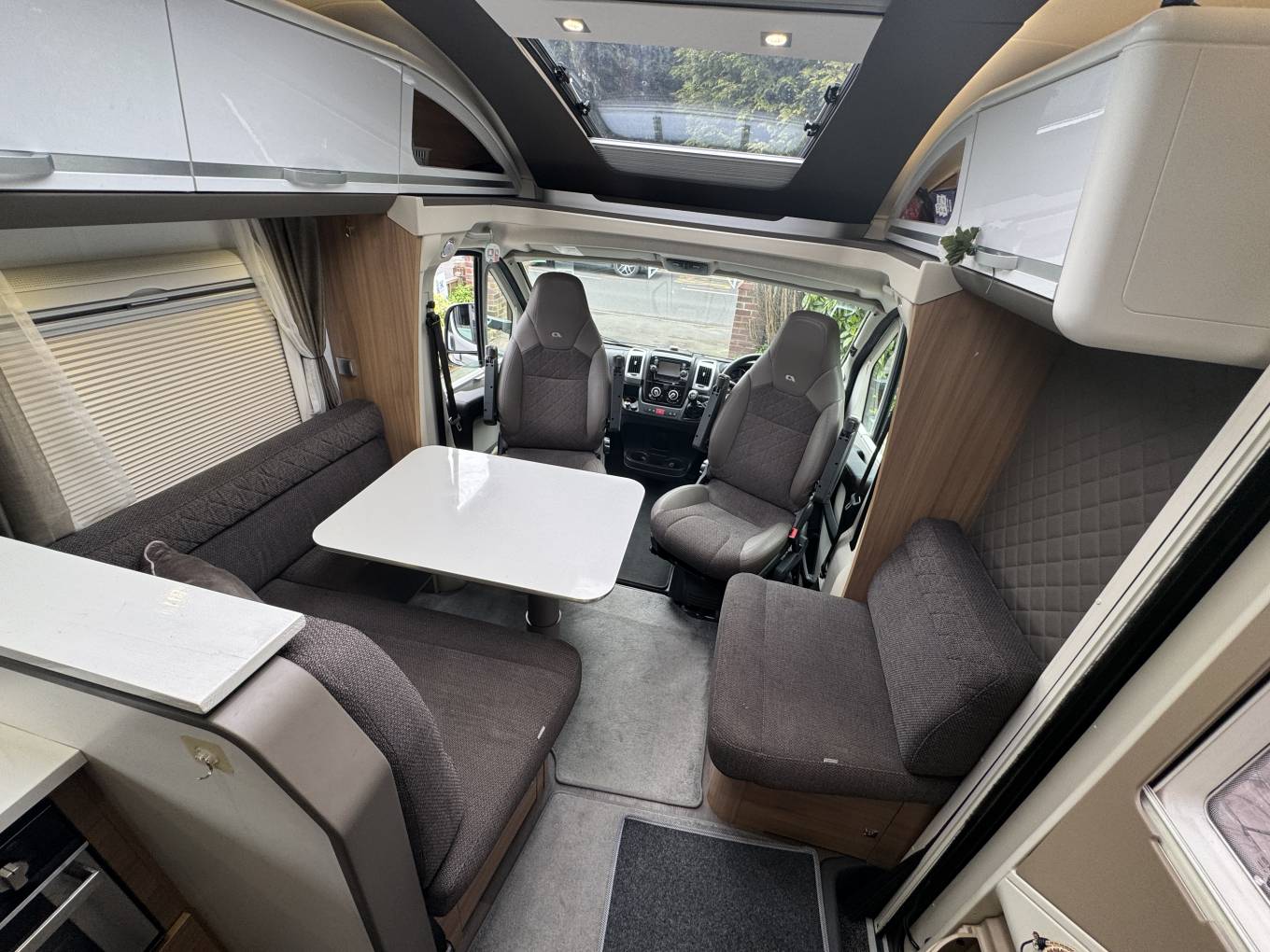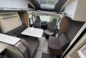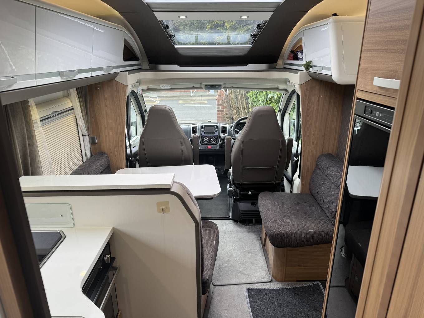 As we head towards the front of the motorhome, we come to the lounge/dining area where there are the rear two travelling seats as apart of a L shape sofa with a further seat adjacent to it. At the front there are driver and passenger seats that both swivel to face the large dining table that is positioned in between that offers that warm family dining experience. This seating area also converts into a good sized single bed or you could fit 2 small children.