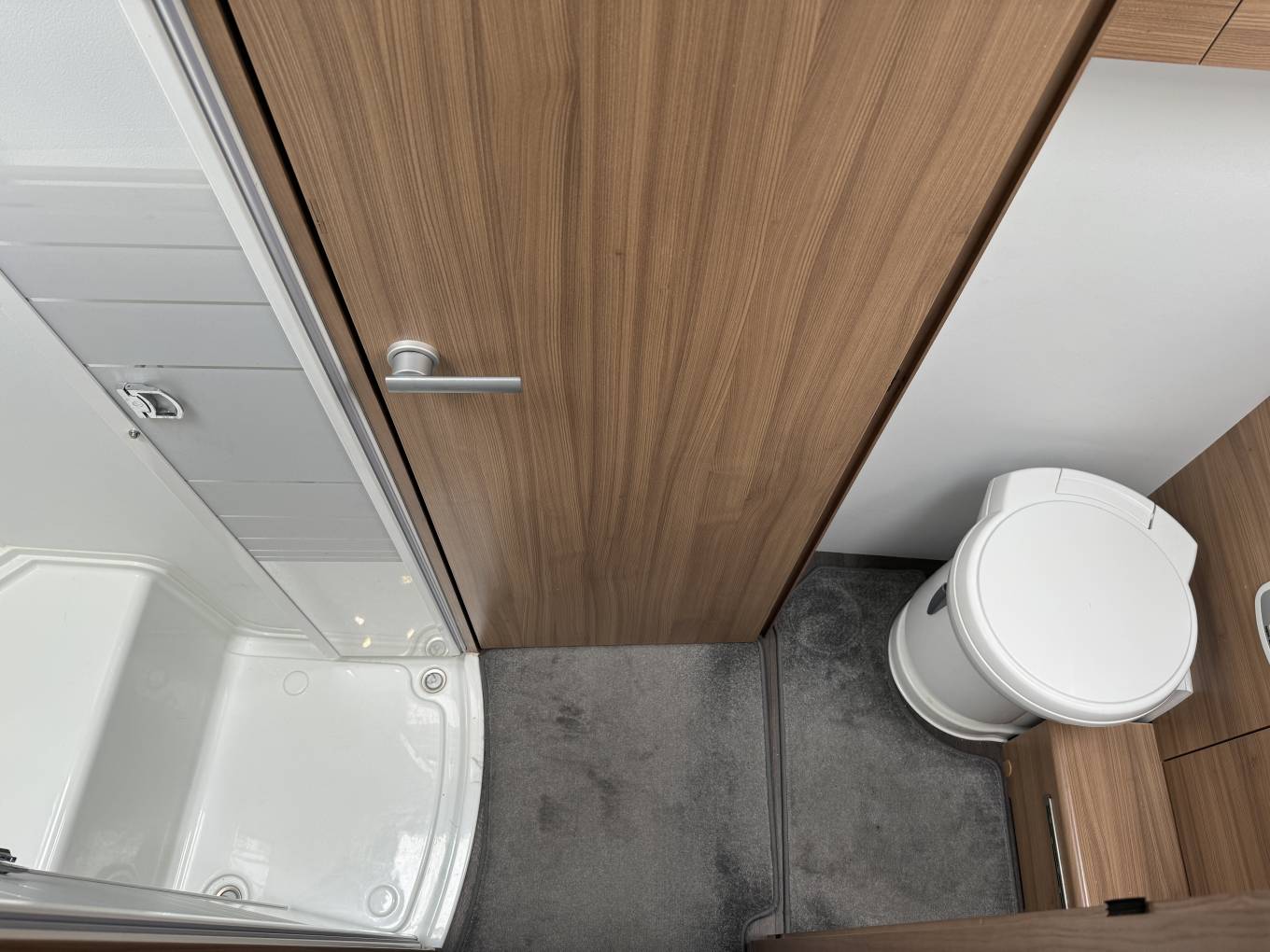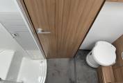 Next we have the large washroom which includes a full length separate shower on one side with a toilet and wash basin on the other along with further storage cupboards and a mirror. This area can be closed off from both the bedroom and lounge area for that much need privacy.