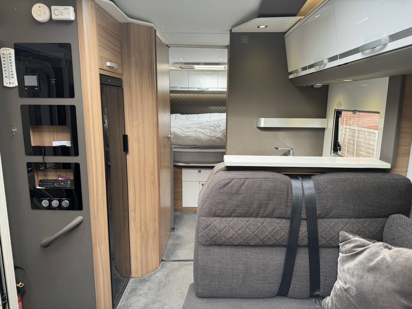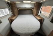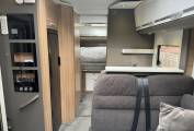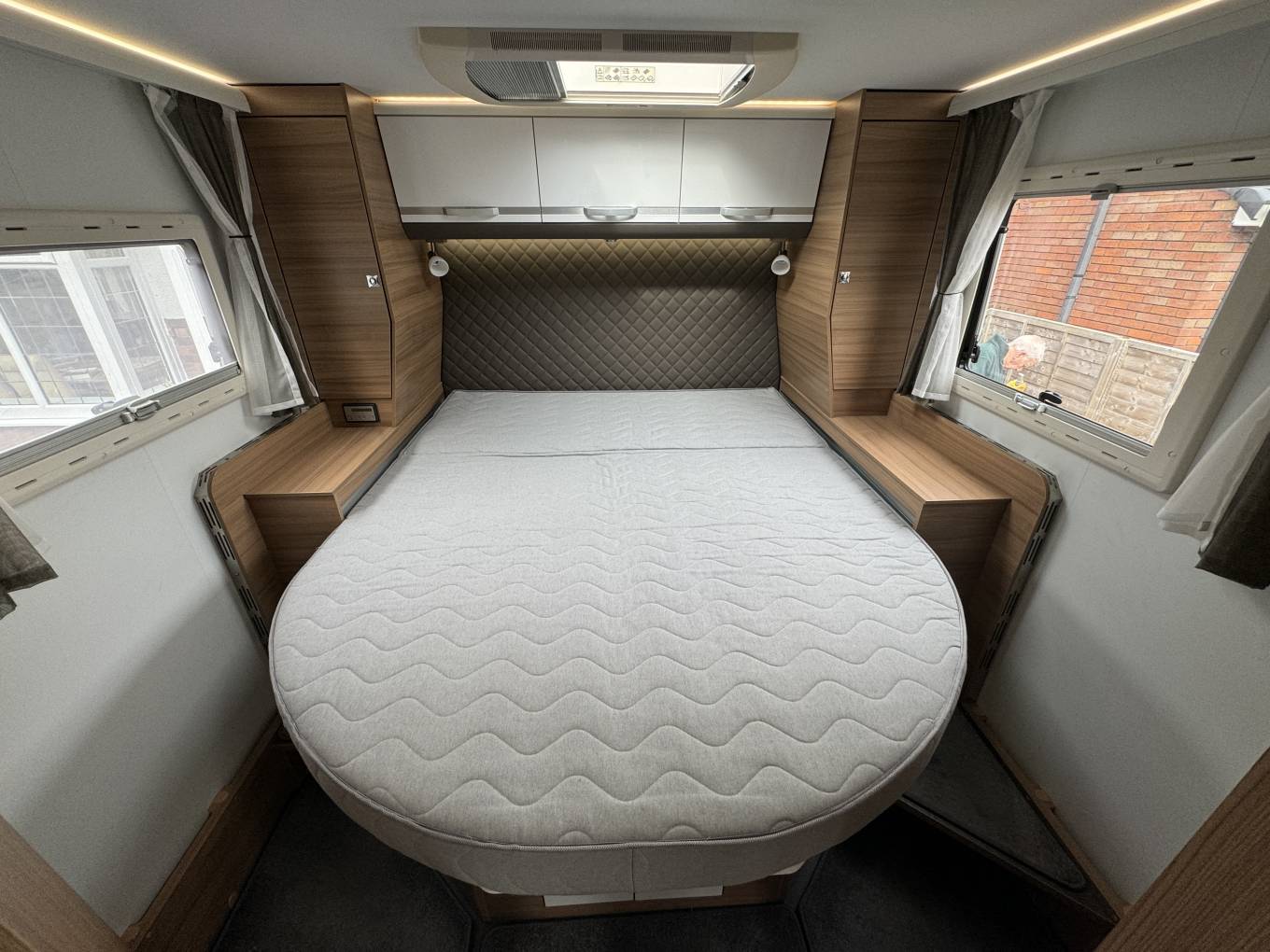 Starting with the rear of the motorhome, you have the very popular island fixed double surrounded by multiple spot lights with plenty of storage space in the overhead cupboards with wardrobes on either side. Underneath the bed is the large garage which has plenty of room to store items such as drive away awnings, bikes, luggage and many other items.