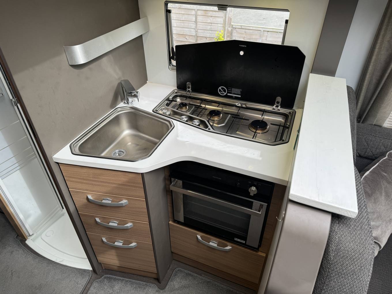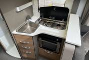 Moving through to the centre of the motorhome, we come to the kitchen area where there is a 3 ring gas hob supplied from the refillable LPG tank located in the exterior storage unit. Next to the cooker is the sink with mixer tap and opposite is the full length Thetford 3 way fridge with freezer compartment as well as several drawers for cutlery and cooking equipment.