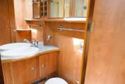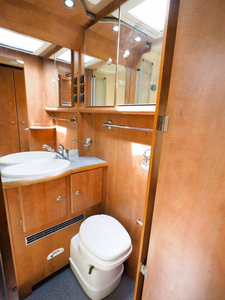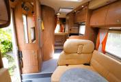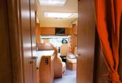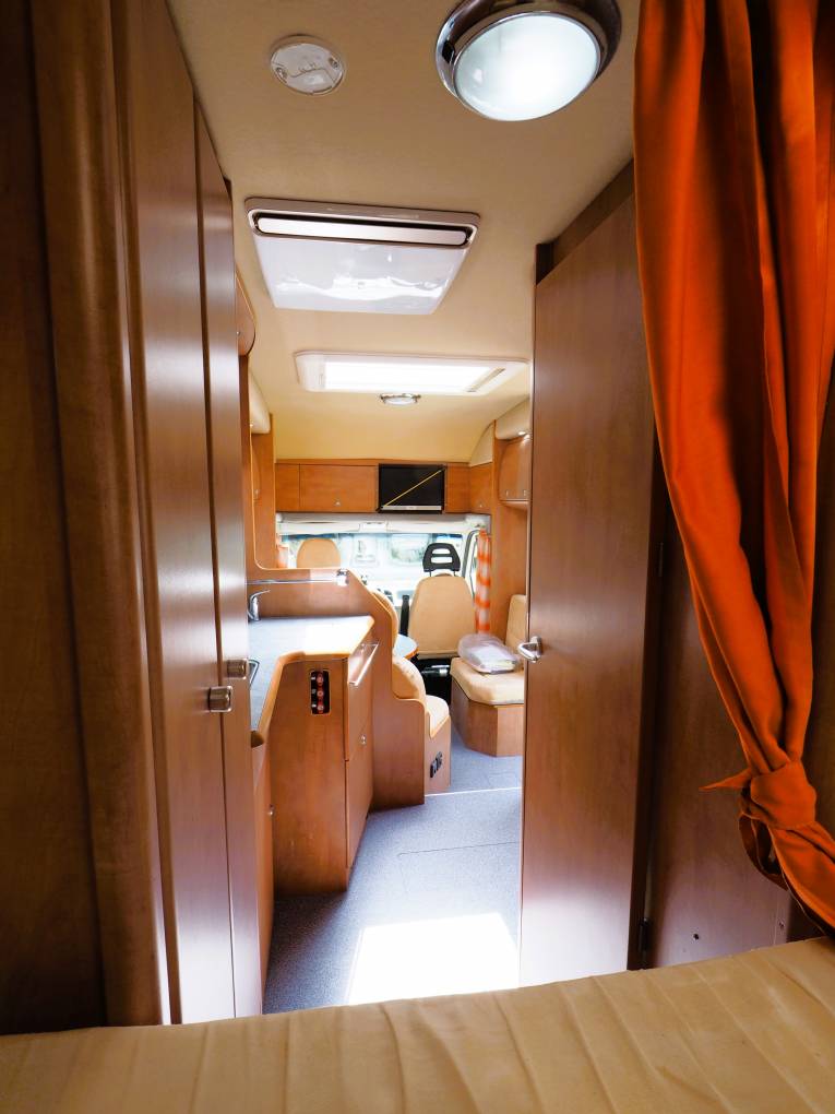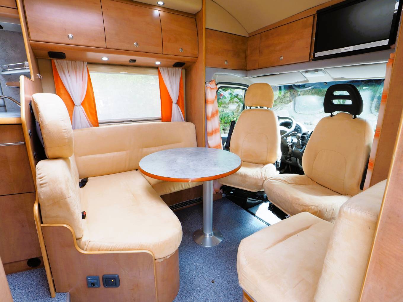 A lounge area that converts to provide a further sleeping space sits around a good sized round table and the front driver and passenger captains chairs swivel inward to provide further seating to the L shaped sofa. A fitted TV sits above the lounge area and there is also a Wi-Fi router included.