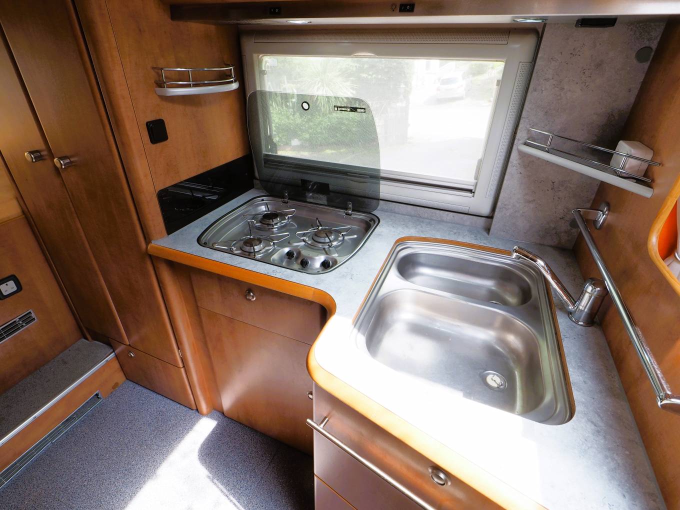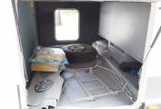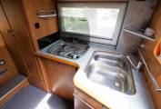 Fully fitted washroom with flushing cassette toilet, sink with vanity mirrors and storage and a separate shower cubicle. There is a SOG system fitted to vent the toilet. The kitchen area has lots of storage space and includes a three burner gas hob, twin sink with mixer tap and work surface covers and a 3 way fridge with freezer box.