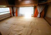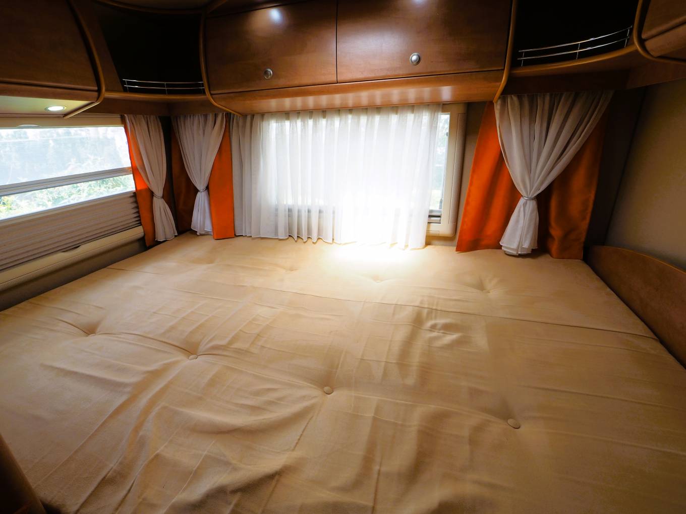 The rear fixed bed provides a large sleeping area and has storage to three sides with overhead lockers and a separate large wardrobe and drawer.