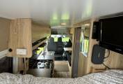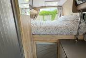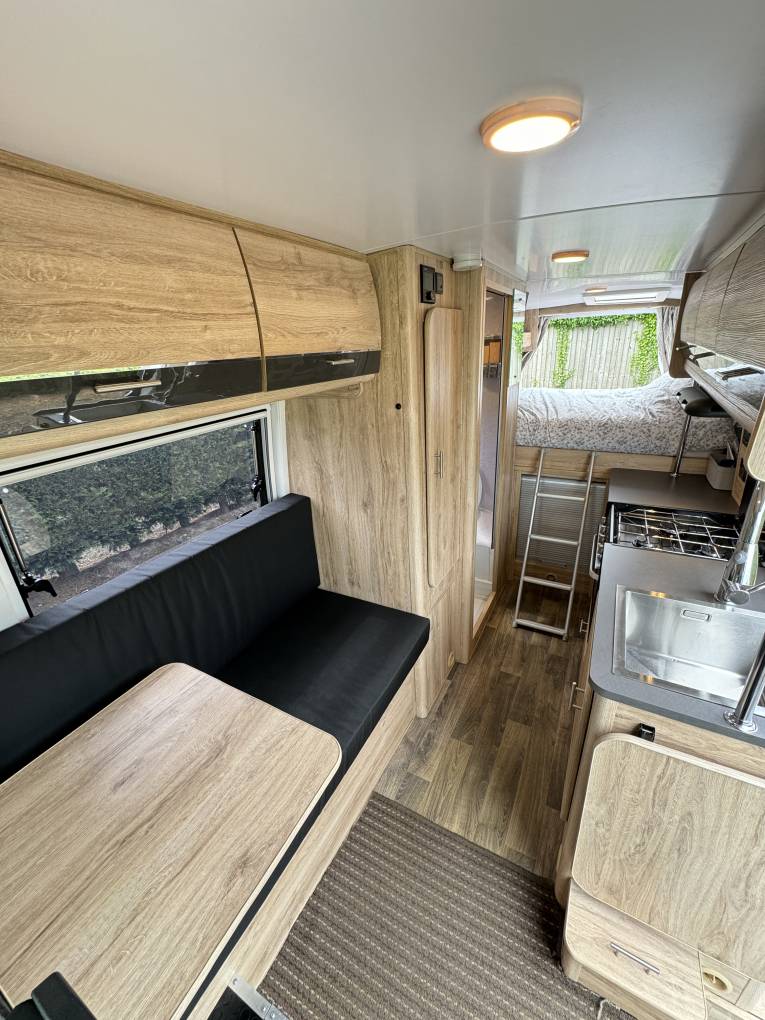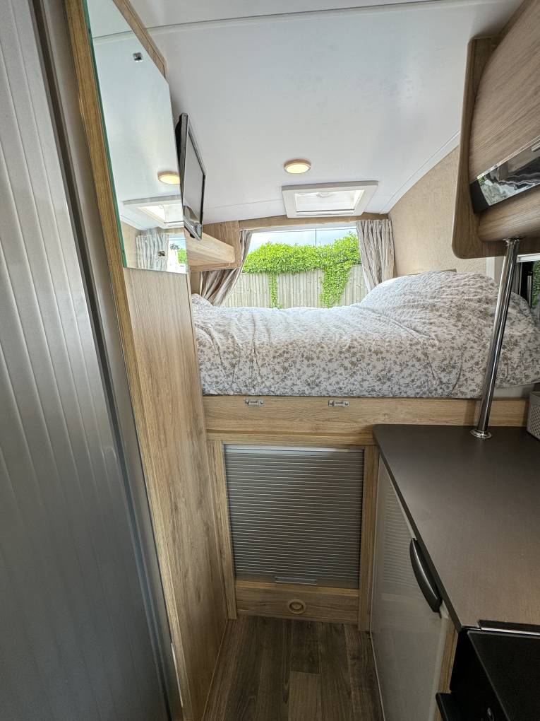 the rear is the large double bed raised accessible by ladder with tv, storage cupboards.