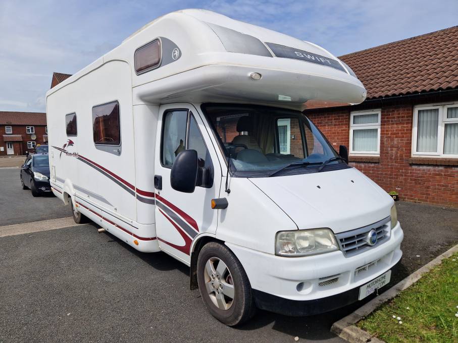 Motorhome Depot are pleased to present this 2003 Swift Kon-Tiki 4-berth,4-belt family motorhome. Based on the Fiat Ducato, it is powered by the 2.8 Turbo diesel engine and 5 speed gearbox. Having only covered 32000 miles,this Swift will come with a new MOT for the next owner's peace of mind and is in good condition inside and out. It has a GVW of 3850kg with a payload of 495kg so will need a C1 licence to drive and is just over 7.4m long.