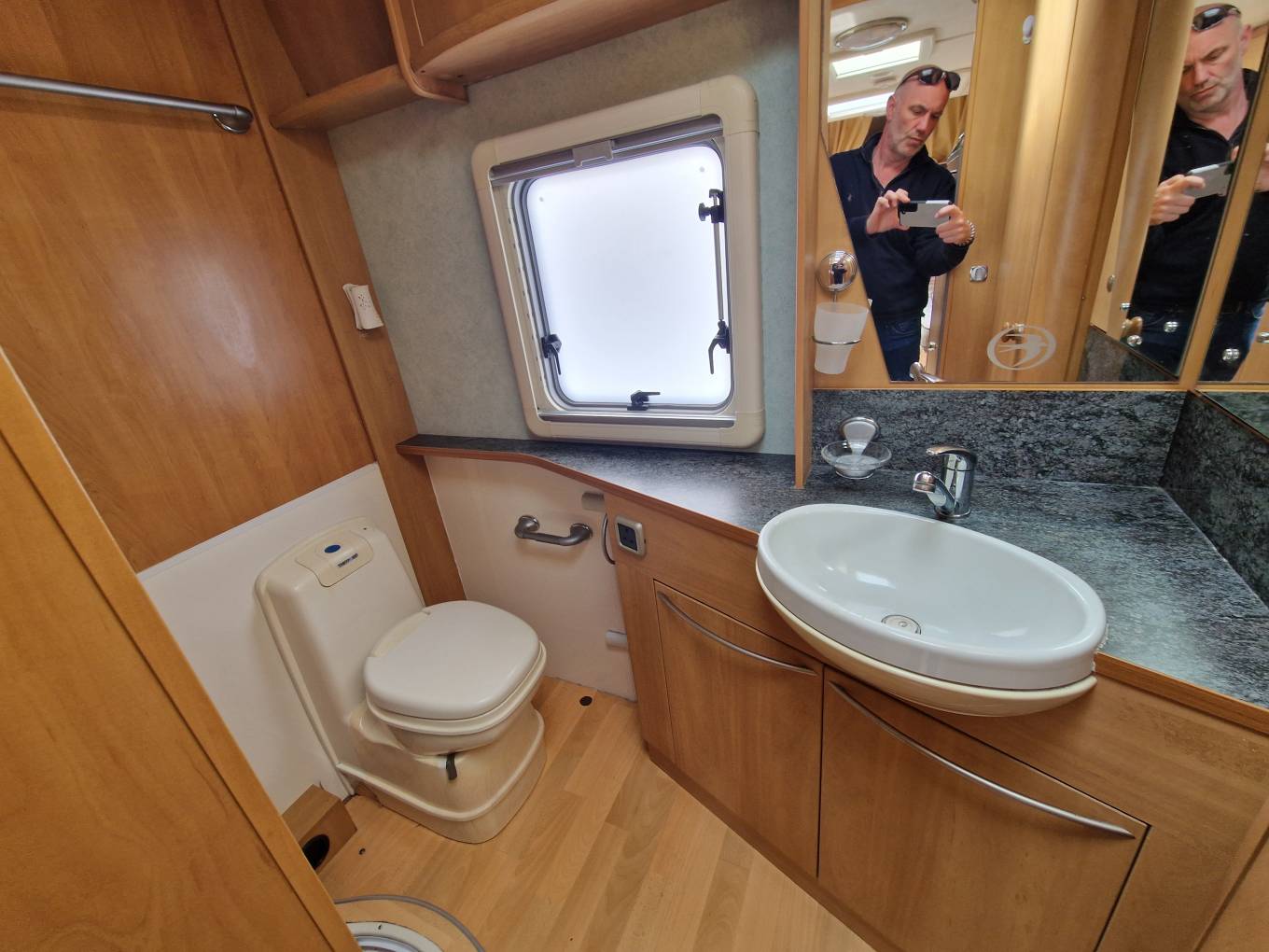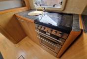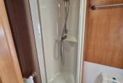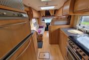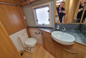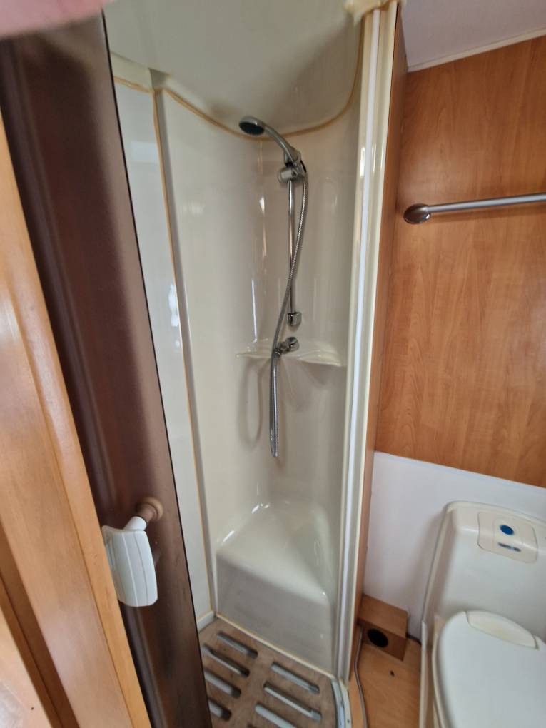 This is the popular full width rear washroom layout with separate shower cubicle, Thetford flush toilet and vanity sink with space to dress and store all your wardrobe requirements for extended stays away.