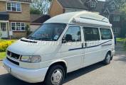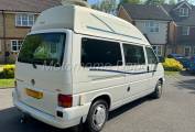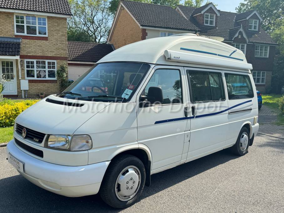 This stunning Torbay conversion with Reimo high top is based on the ever popular Volkswagen T4 LWB chassis with the 2.5 Turbo Diesel engine and the 5 speed manual gearbox. Only 4 owners from new having covered a mere 74732 miles in its life, the current owner has had it since 2017 and it has a comprehensive mechanical service history including 13 stamps in the book including a Cam belt at 07/17 at 63K and a full clutch kit in 2021. The cab benefits from: power assisted steering; Electric windows front; central locking front; single din Radio/tape head unit.