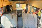 We enter the camper on the passenger side immediately to your right are two forward facing single seats with 3 point seat belts for travelling passengers. There is a dining table that can be fitted to a rotating leg base so that it can be positioned in many axis. The front two seats rotate to join this area so you could seat 4 people while entertaining on site. At night the rear seats incline to make up two singles beds using the base of the front seats for your feet. This leaves gangway rear. Alternatively the beds will push together to make a large double. There is storage in the base of both the passenger seats.