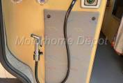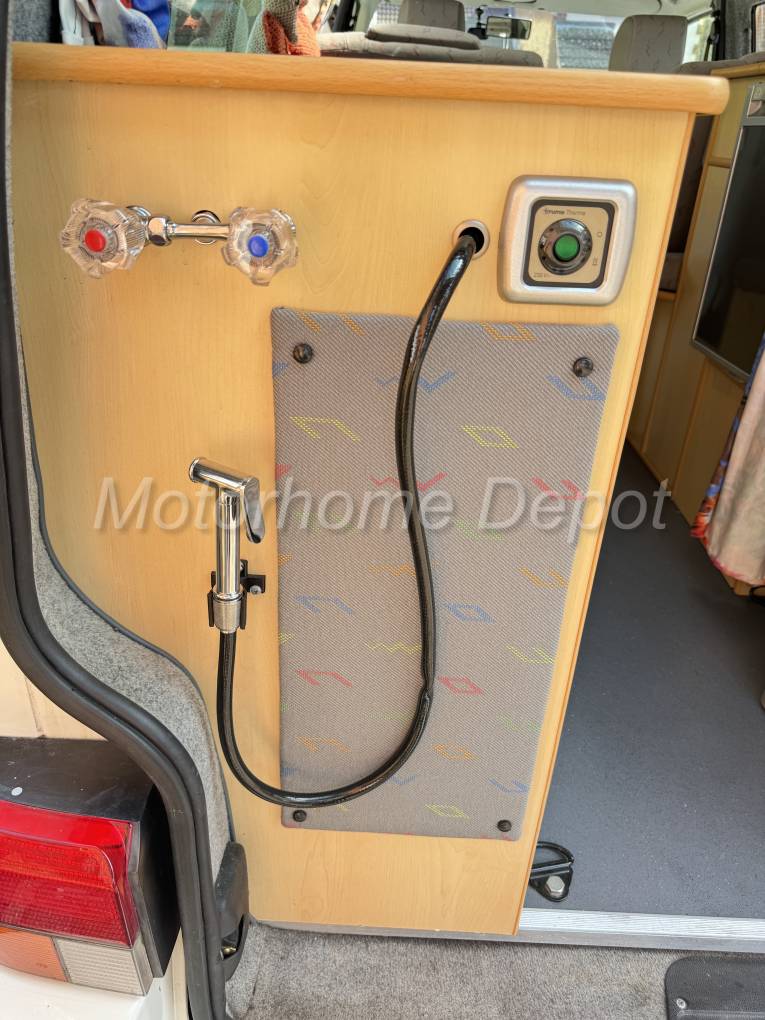 With the tailgate open there is shower tent that can be fixed around the edge giving privacy whilst in use. Hot water is supplied by a Truma Therme 240v boiler supplying the sink & shower.