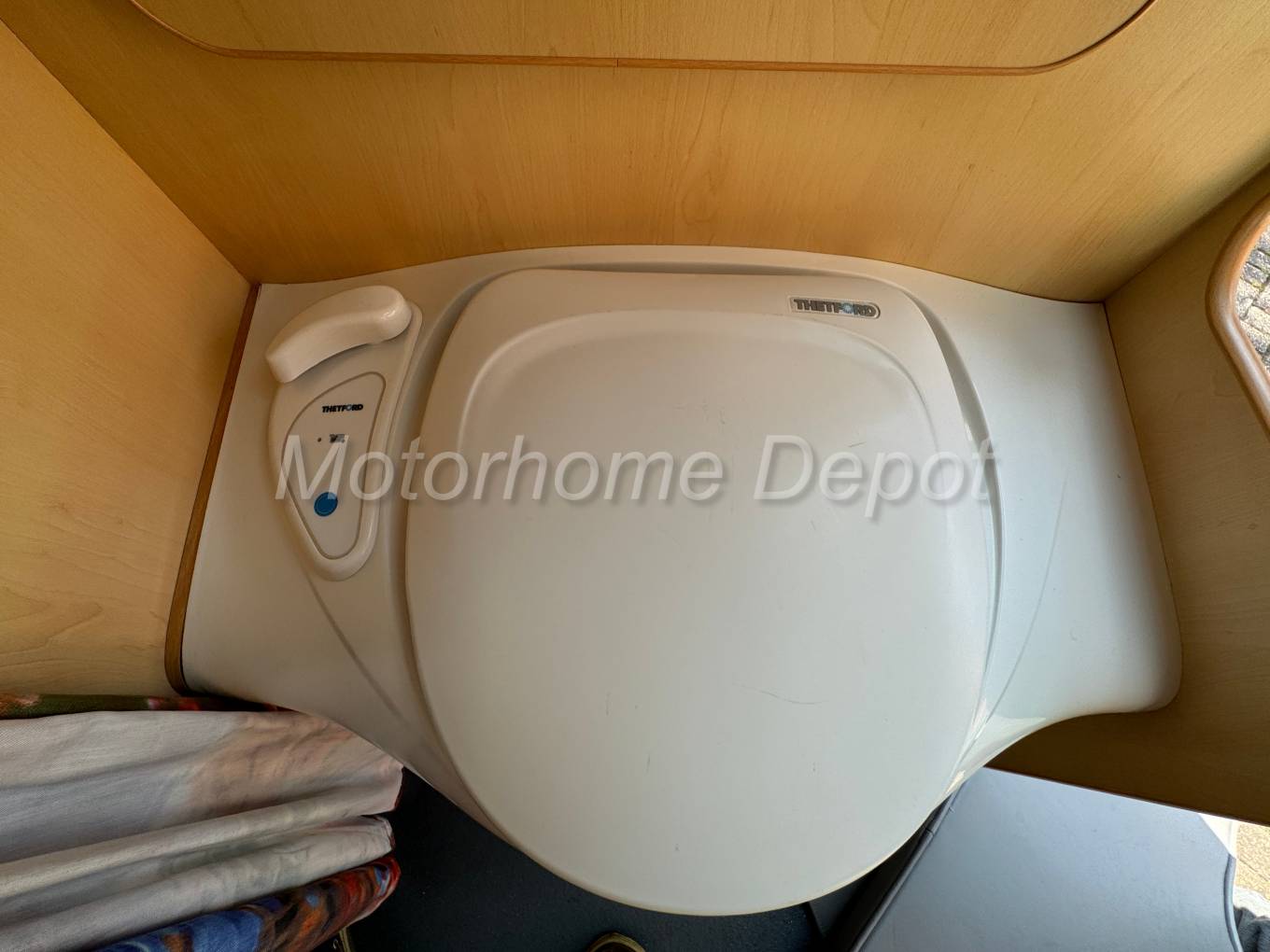 The rear section can be partitioned off front & rear for use of the Thetford cassette style toilet with fresh water flush. When this is not in use there is a padded cover to make a seat while cooking. Behind there is also a hanging wardrobe.