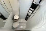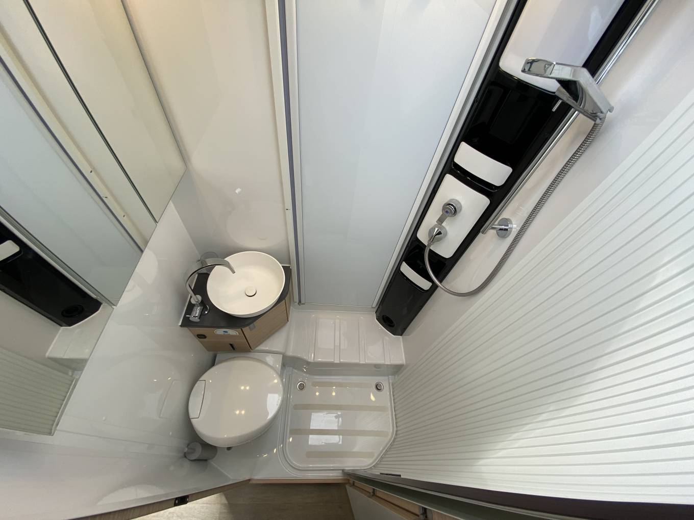 washbasin with mixer tap, a swivelling Thetford cassette toilet, medicine